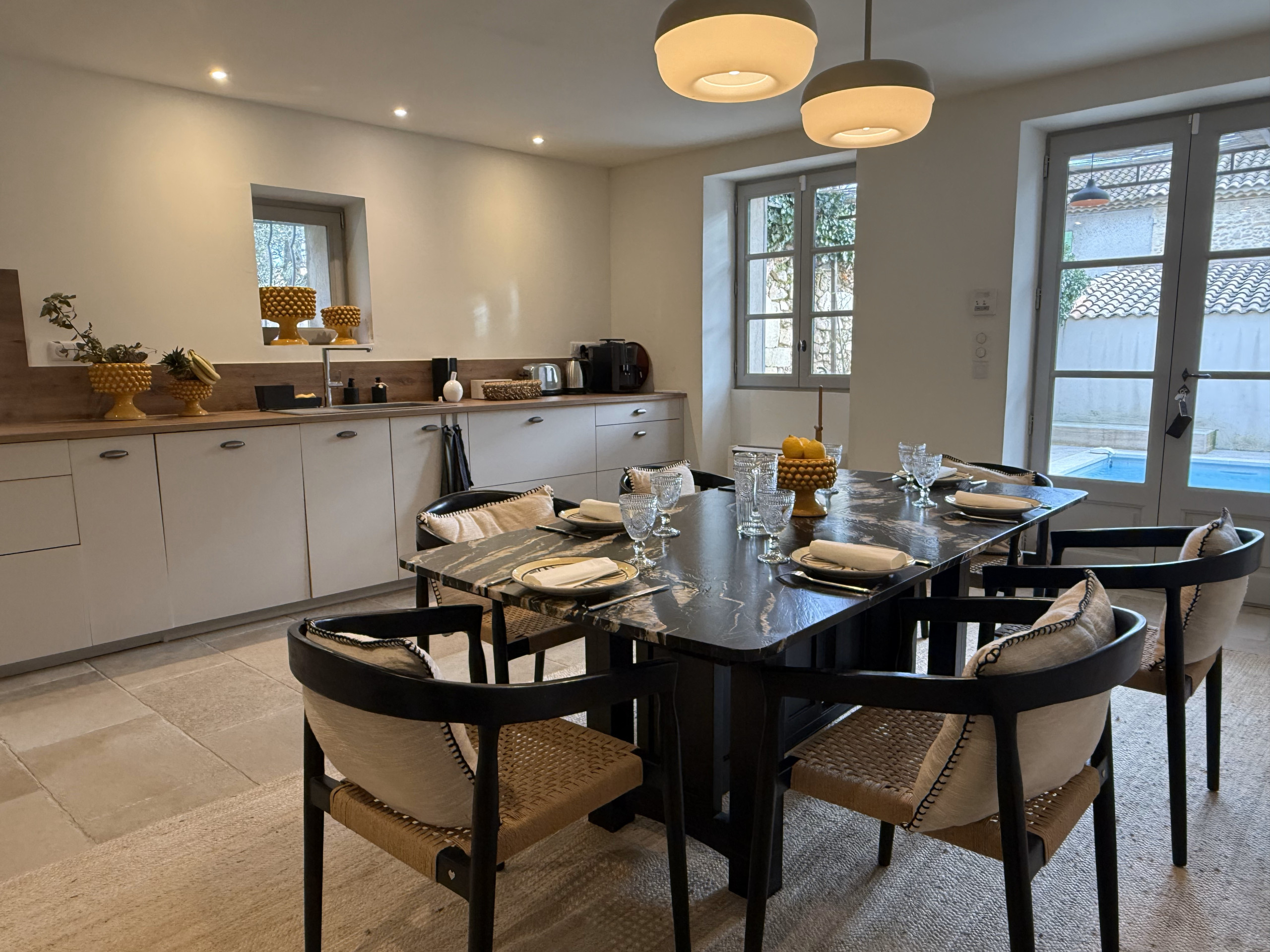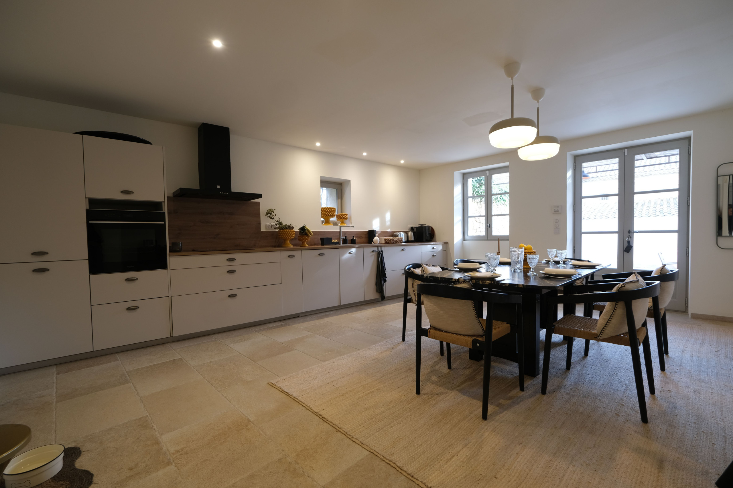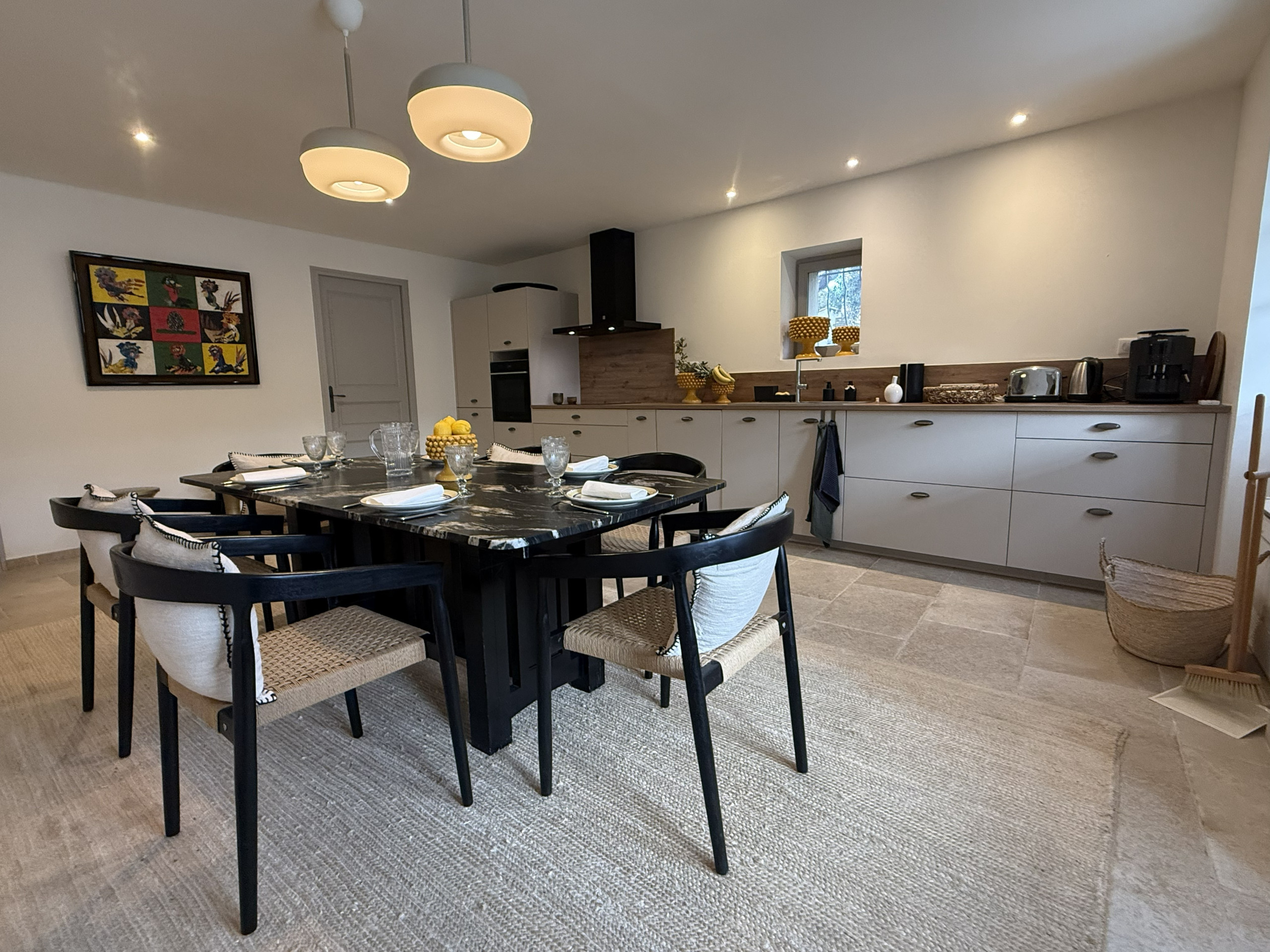 Kitchen and dining area (25 m²) equipped with a fridge, a 3-burner ceramic hob, an oven, a microwave, a dishwasher, a toaster, a kettle, a Nespresso coffee machine and a filter coffee machine.