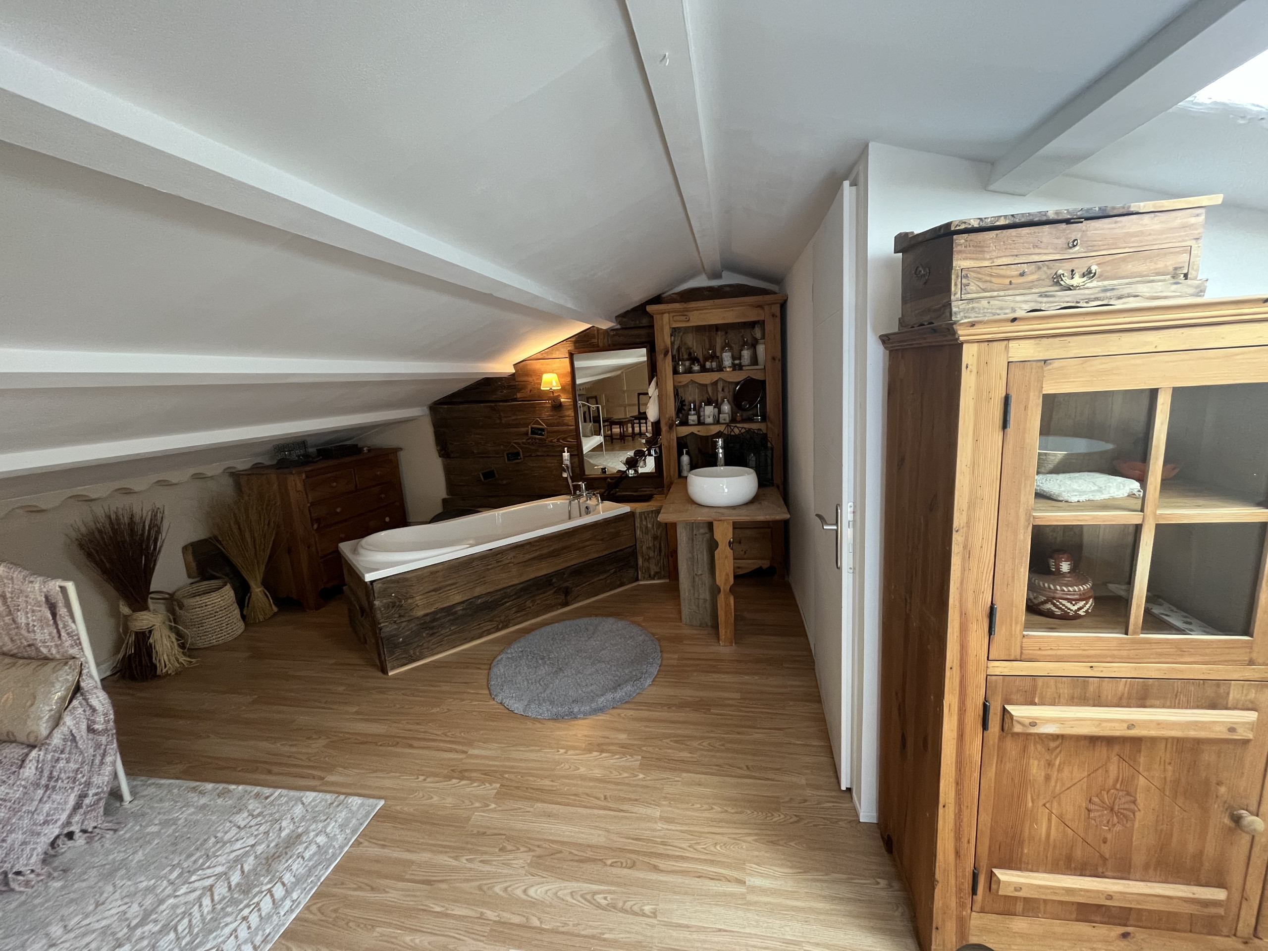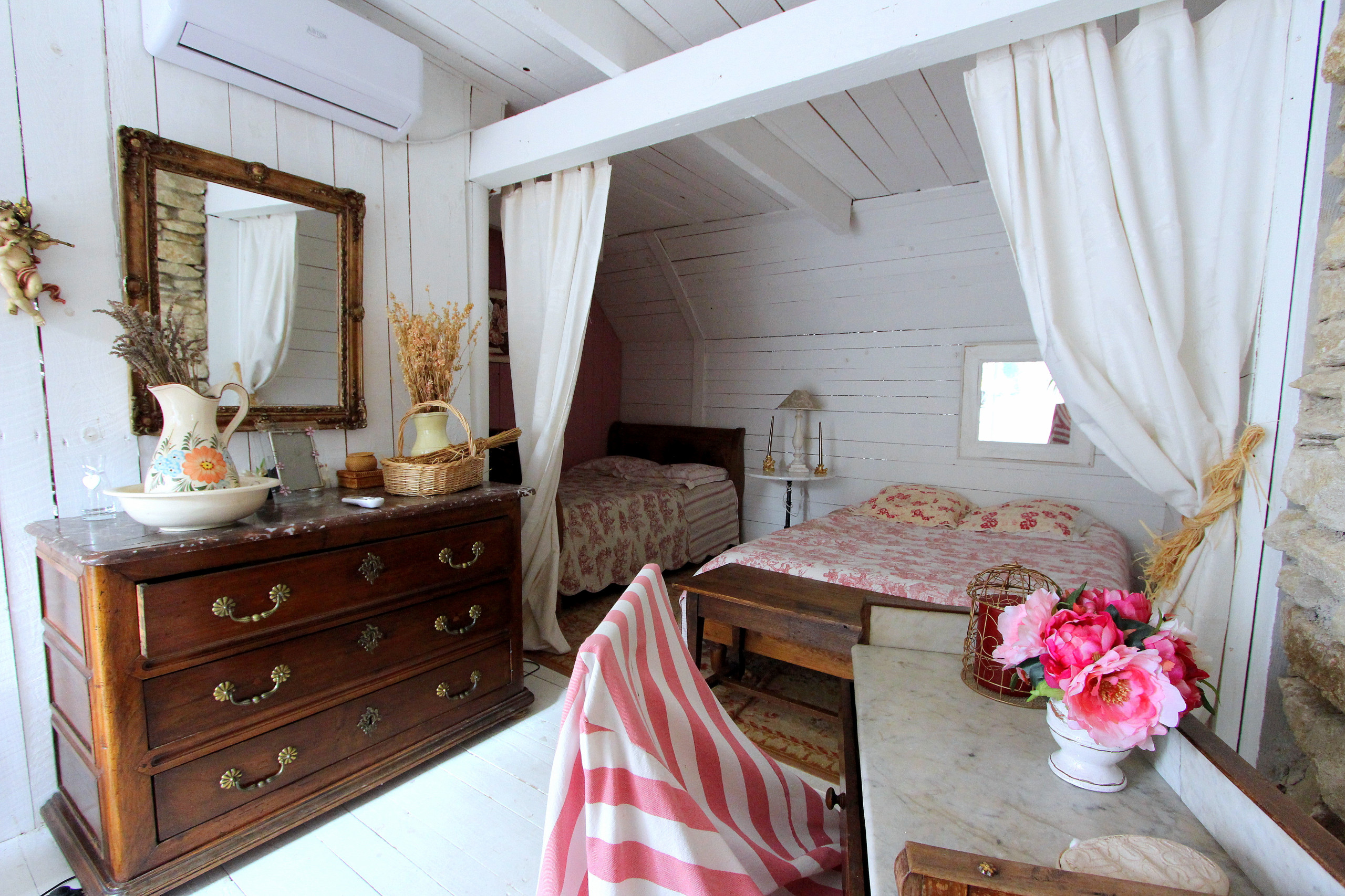 • One air-conditioned bedroom with double 160 bed, adjoining bathroom (2 basins, bathtub, shower and WC), opening onto a lovely veranda facing the garden