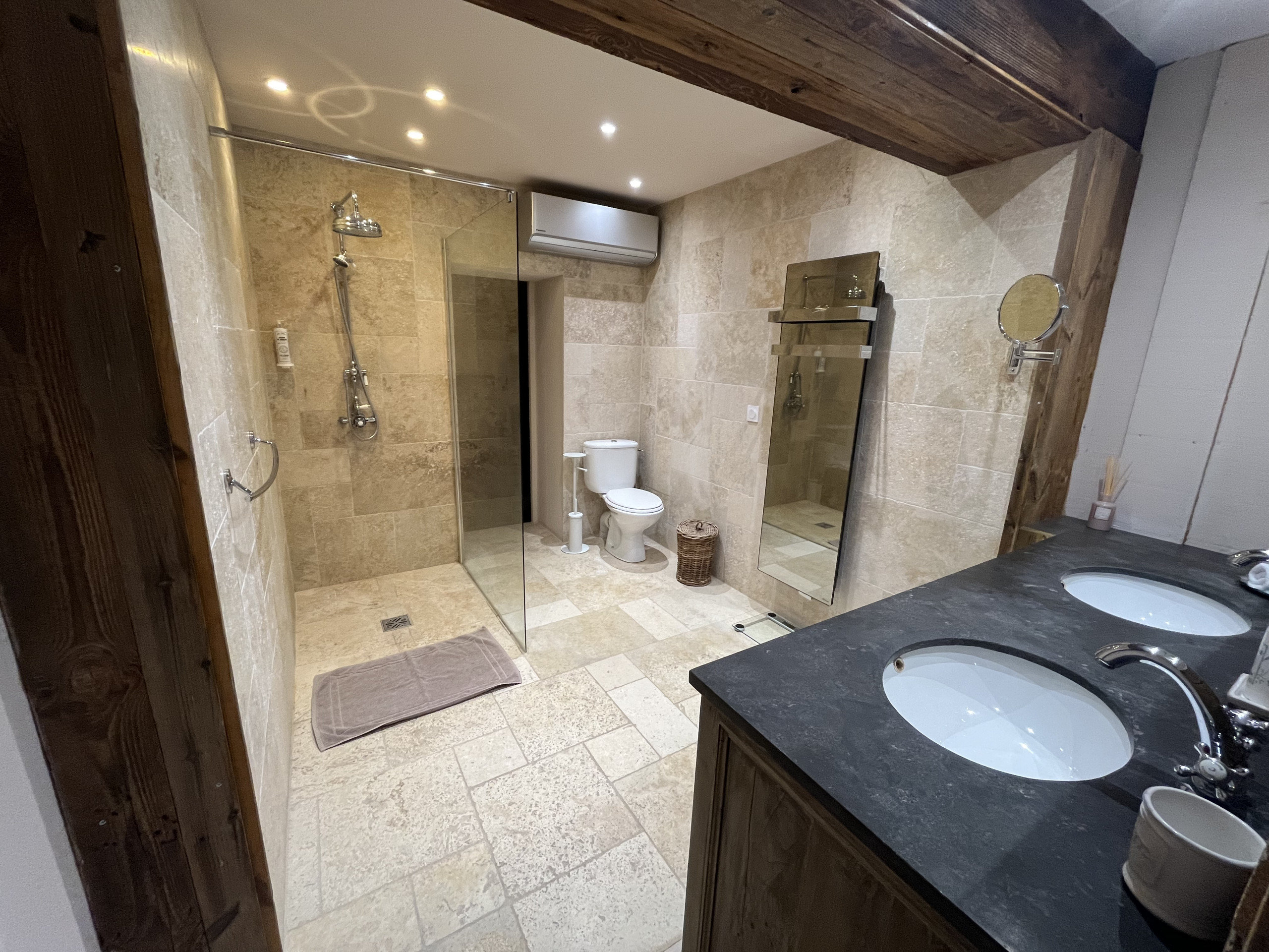 • One air-conditioned bedroom with double 160 bed and adjoining bathroom (1 basin, 1 shower)