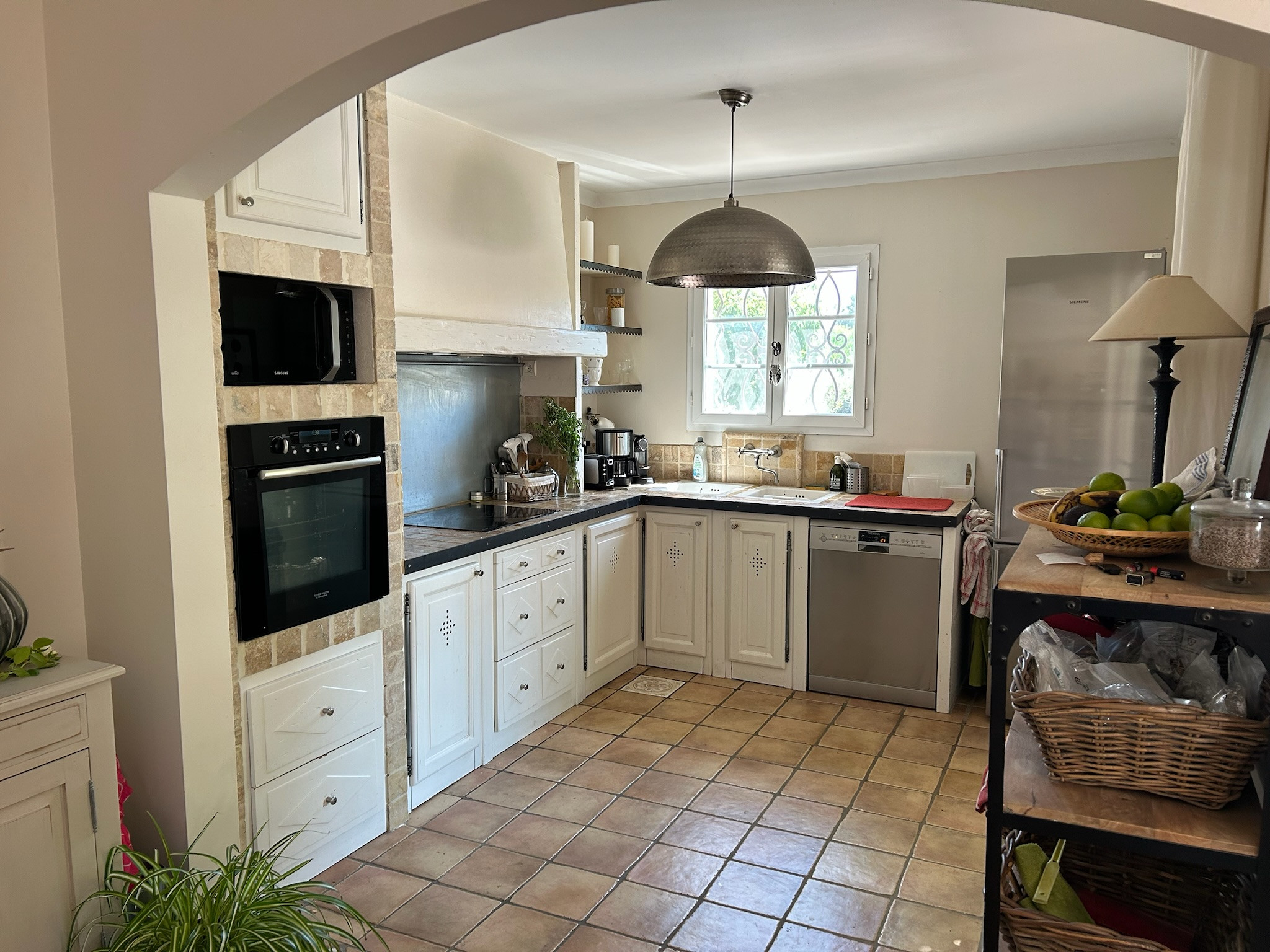 Une cuisine (20m²) ouvrant sur la pièce à vivre, équipée d’une plaque de cuisson vitrocéramique 3 feux, d’un four, d’un four micro-onde, d’un lave-vaisselle, d’un toaster, d’une bouilloire, de deux cafetières (Nespresso et une cafetière à filtre).