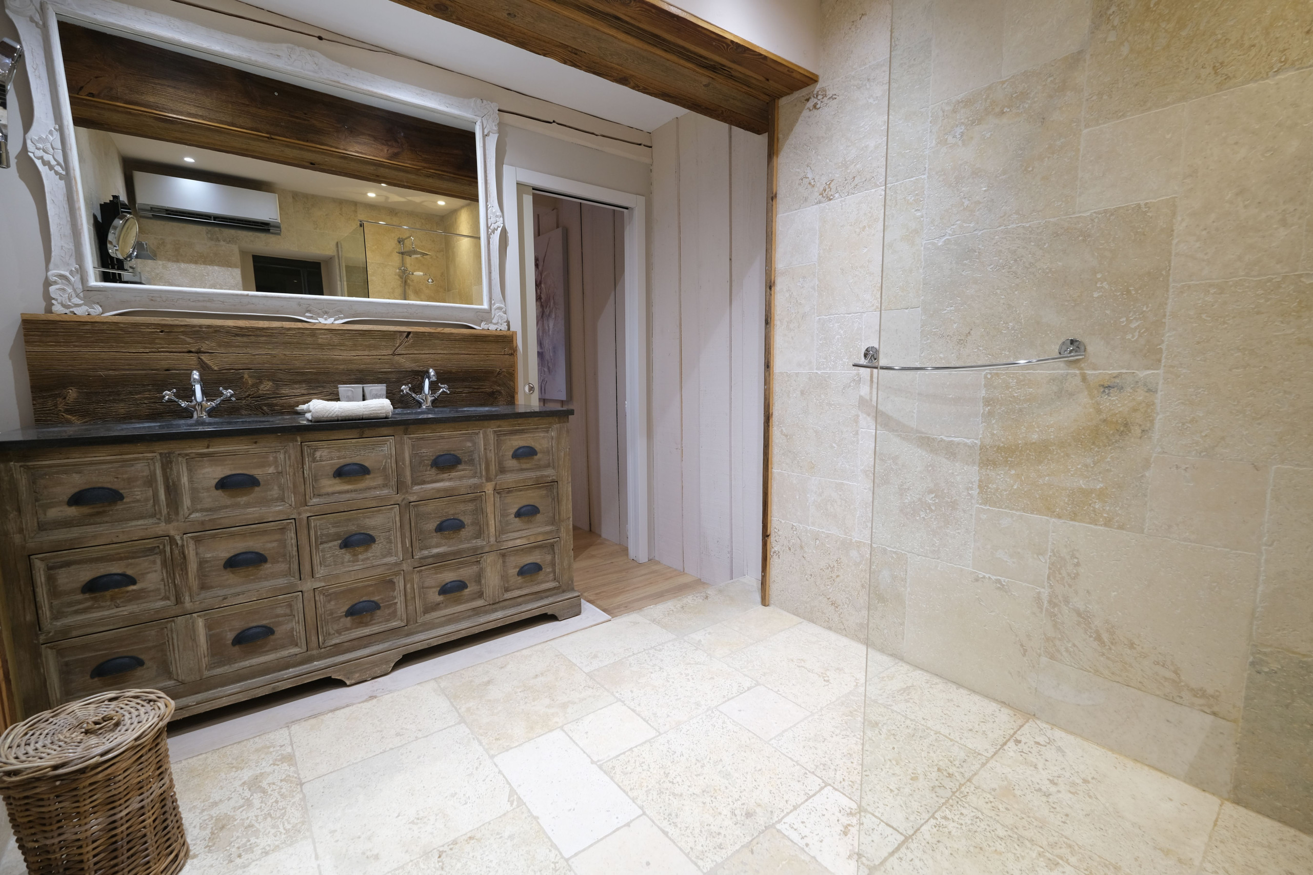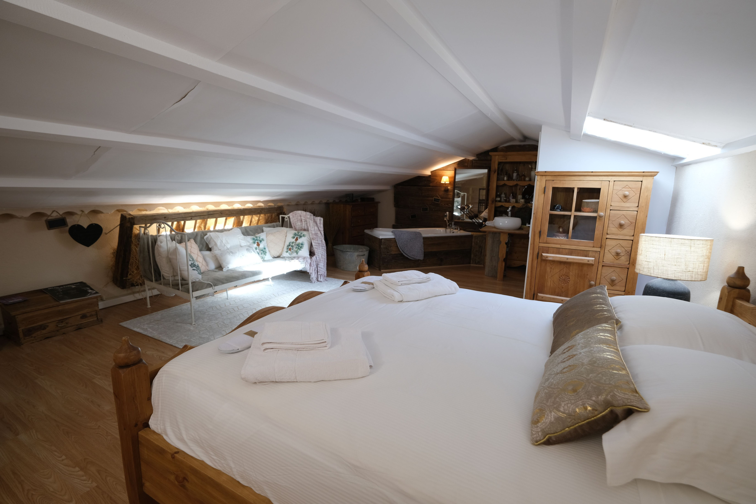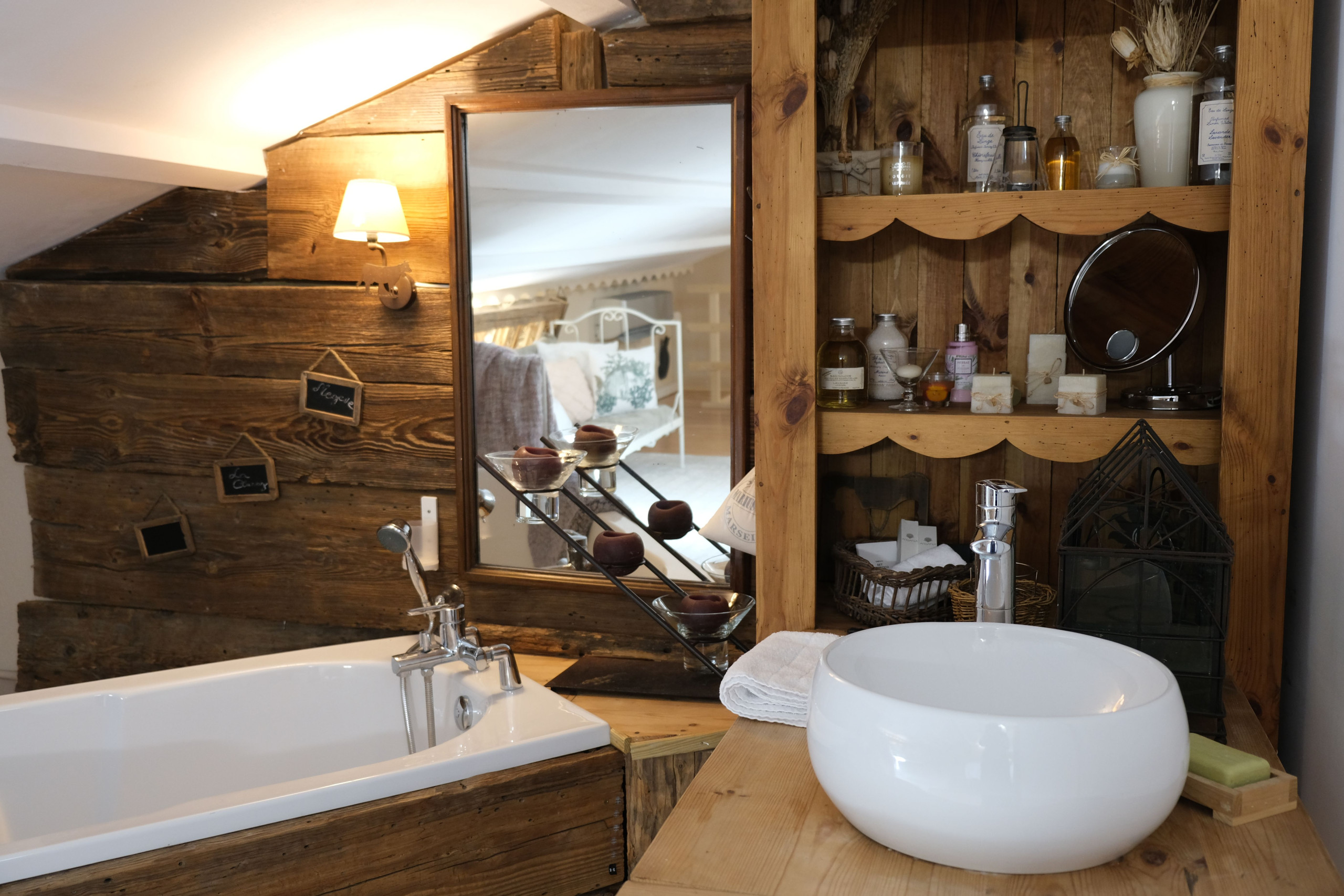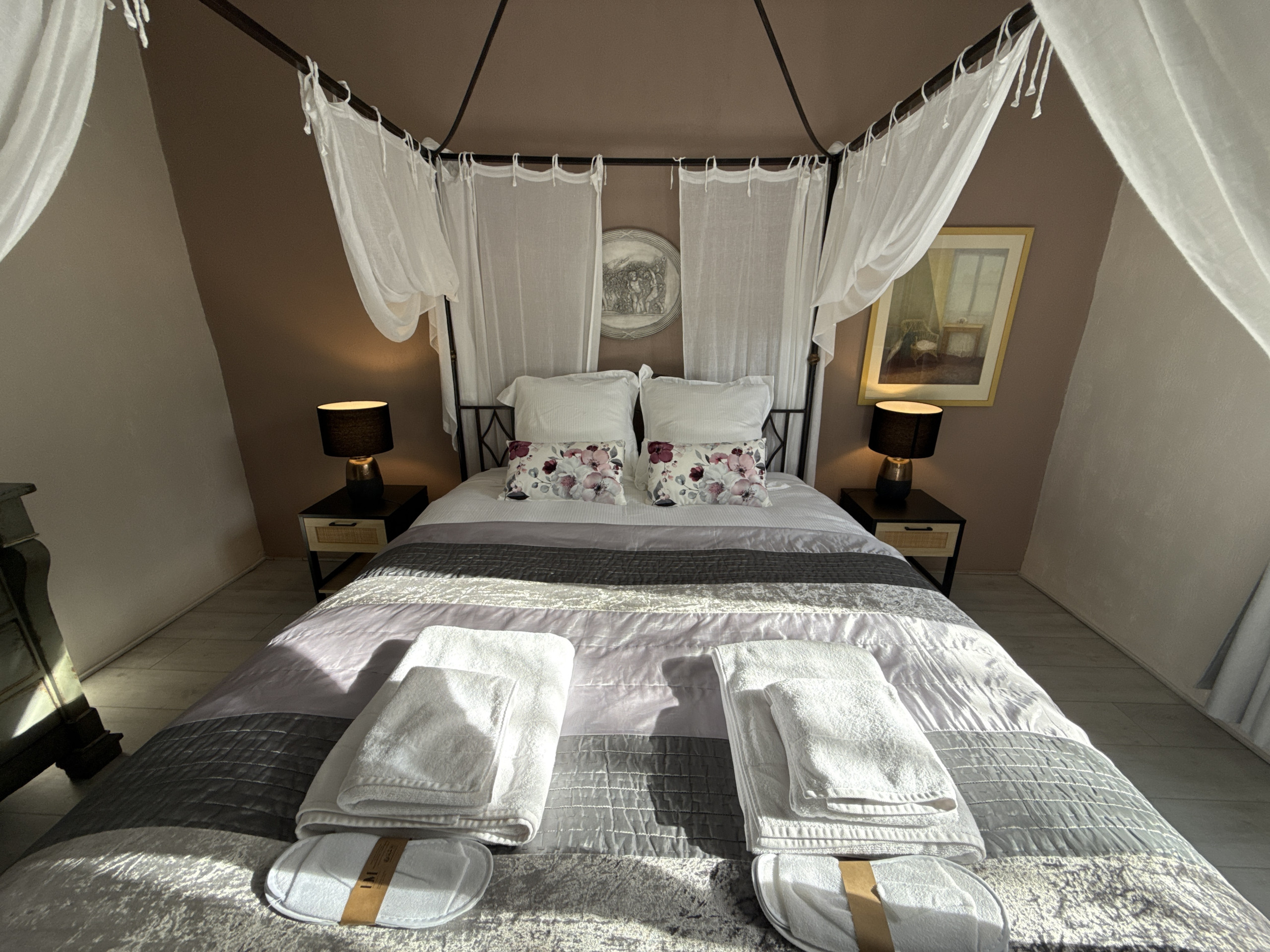 • Une chambre climatisée avec lit double 160, salle d’eau attenante (2 vasques, baignoire, douche et WC), ouvrant sur une jolie véranda face au jardin avec une baignoire pour ce qui aime se détendre en regardant le jardin.