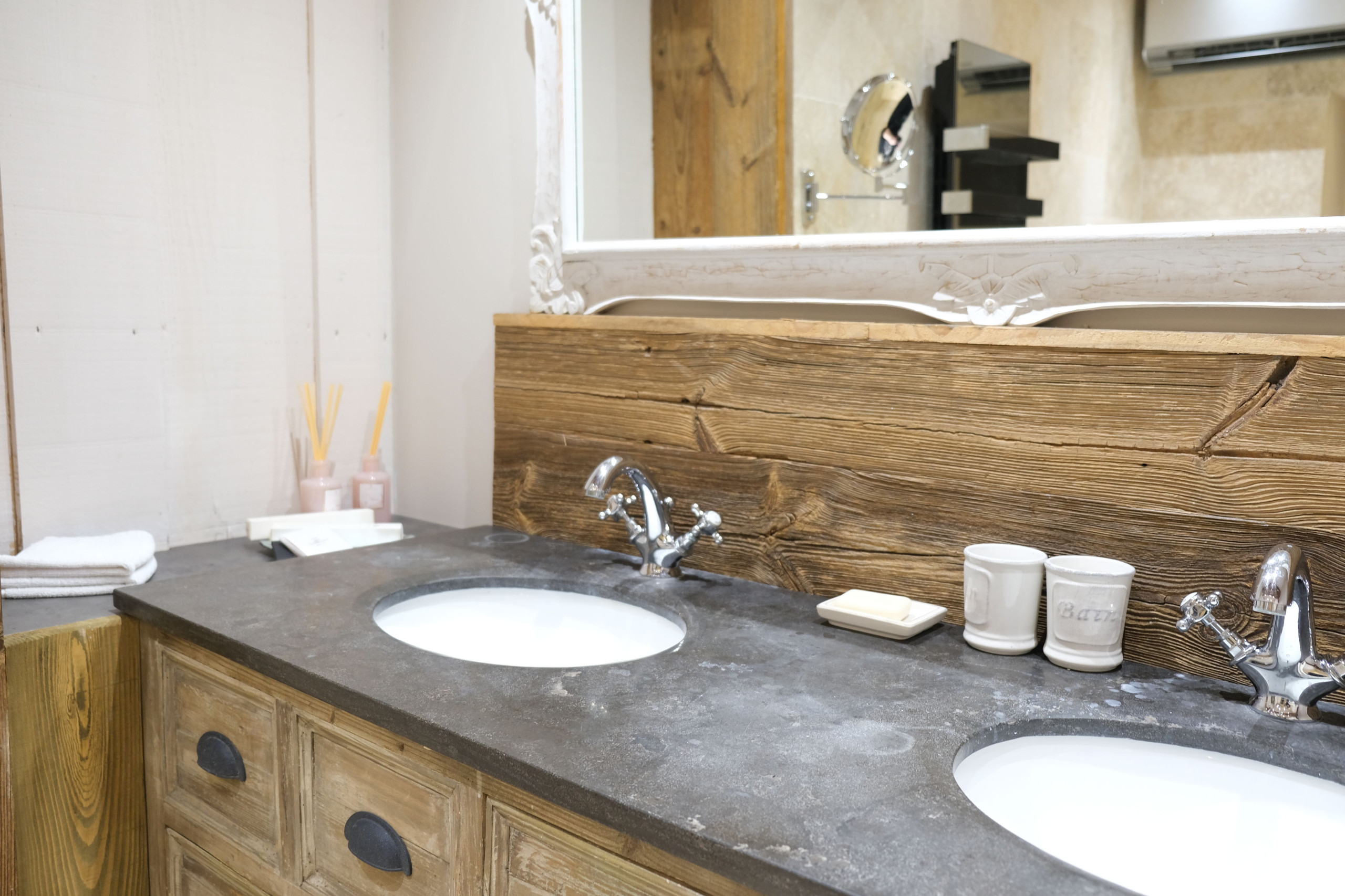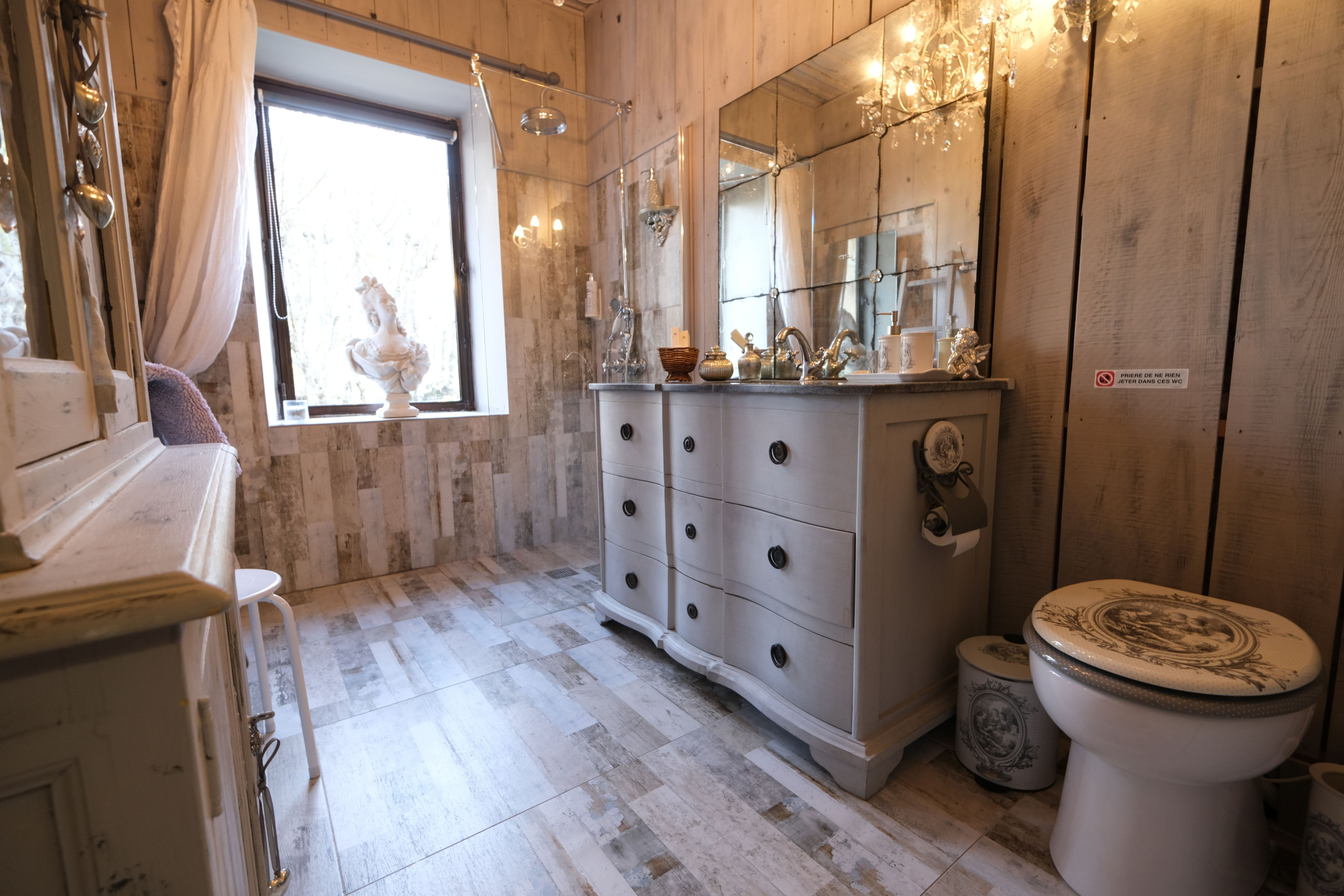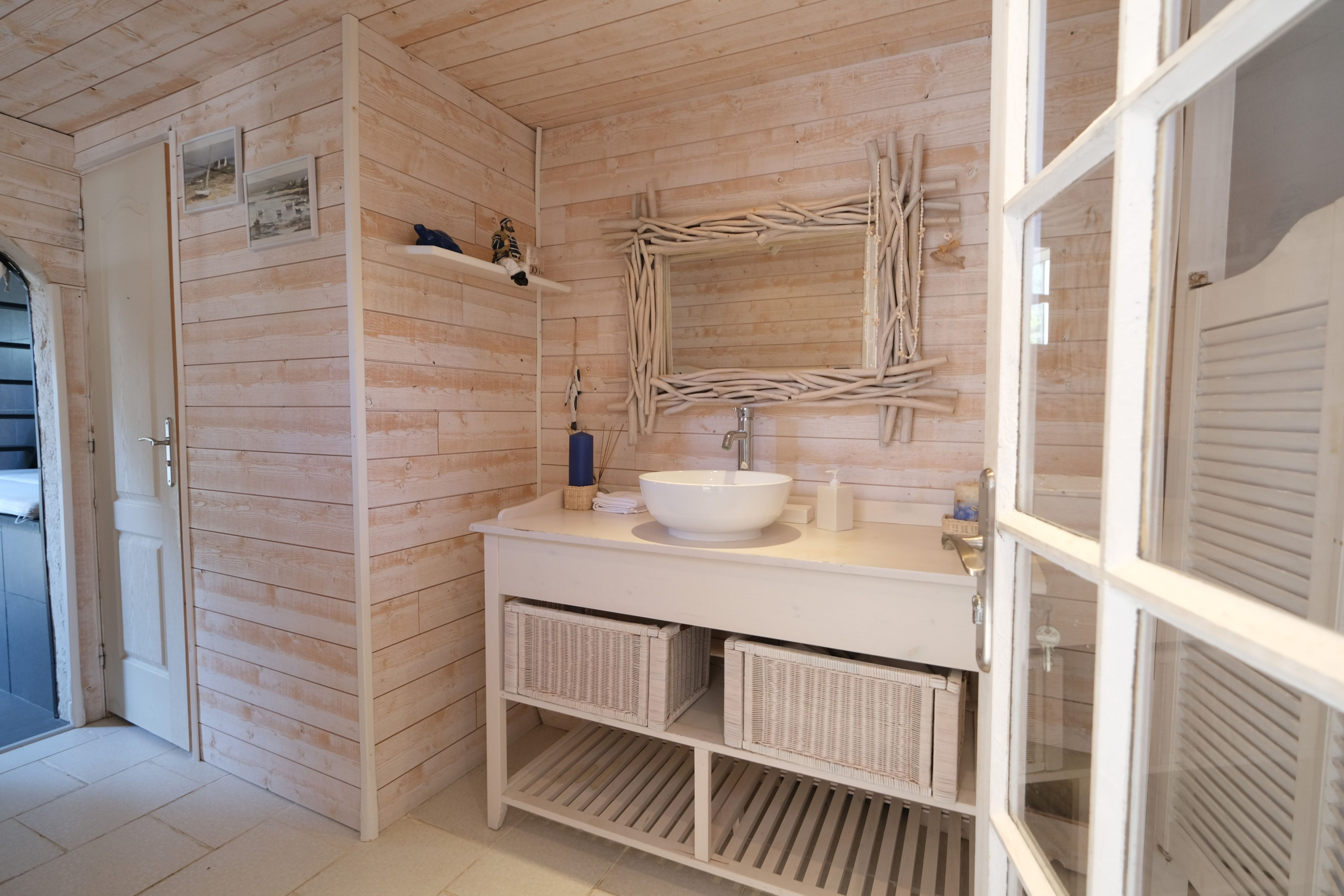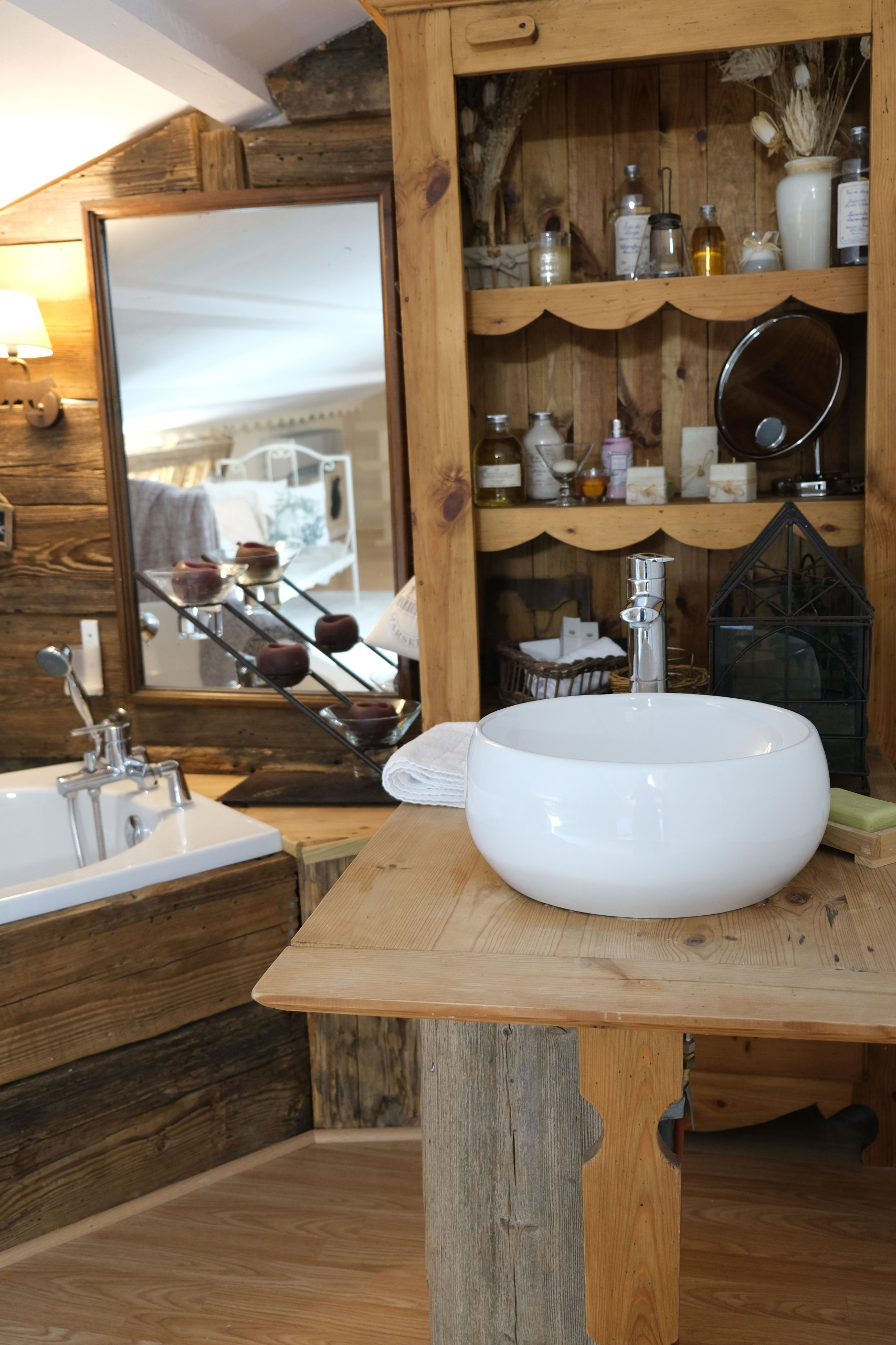 • Une chambre climatisée avec lit double 160, salle d’eau attenante (2 vasques, baignoire, douche et WC), ouvrant sur une jolie véranda face au jardin avec une baignoire pour ce qui aime se détendre en regardant le jardin.