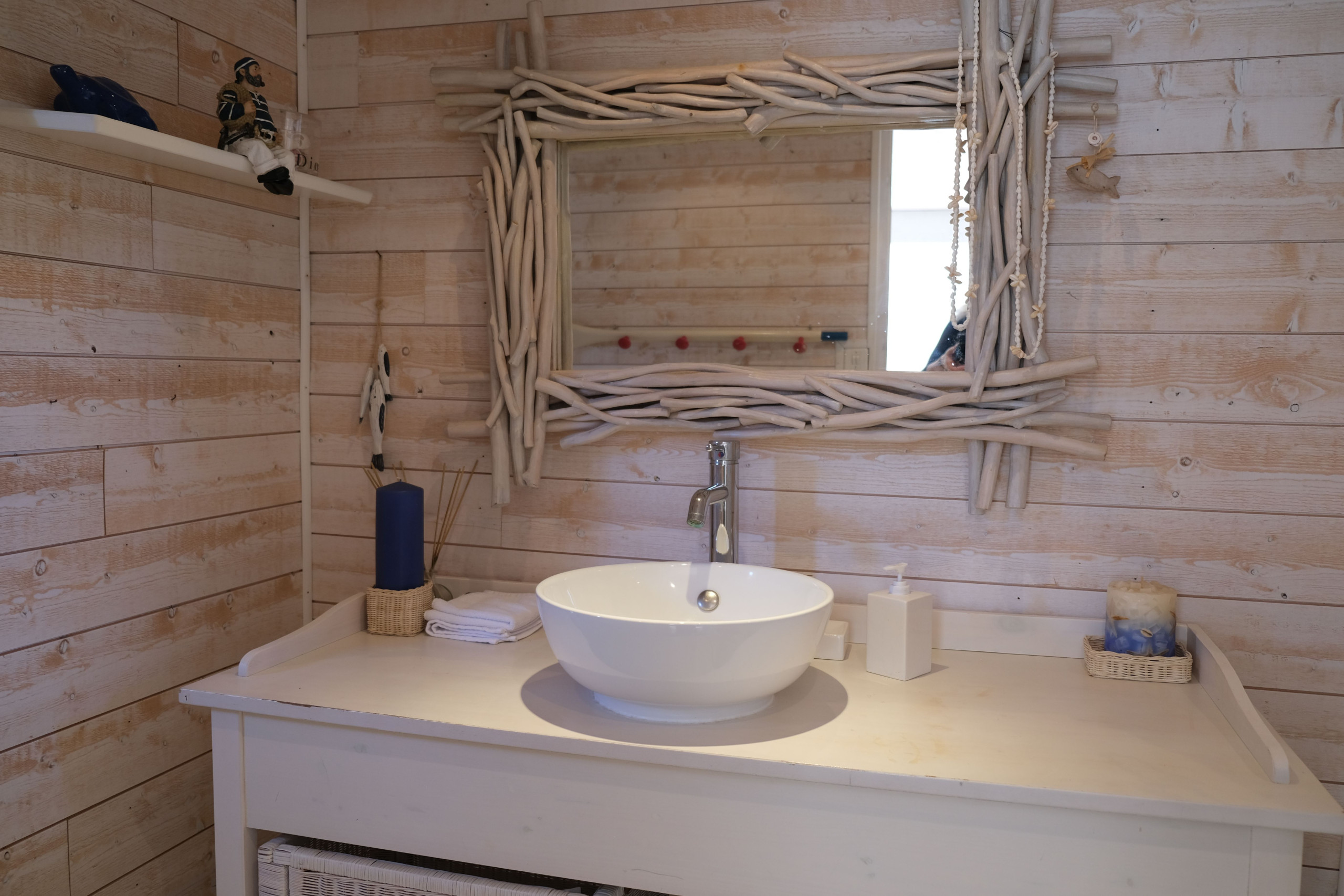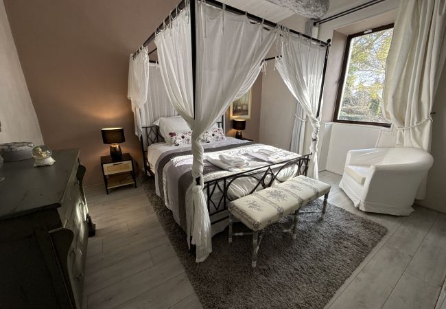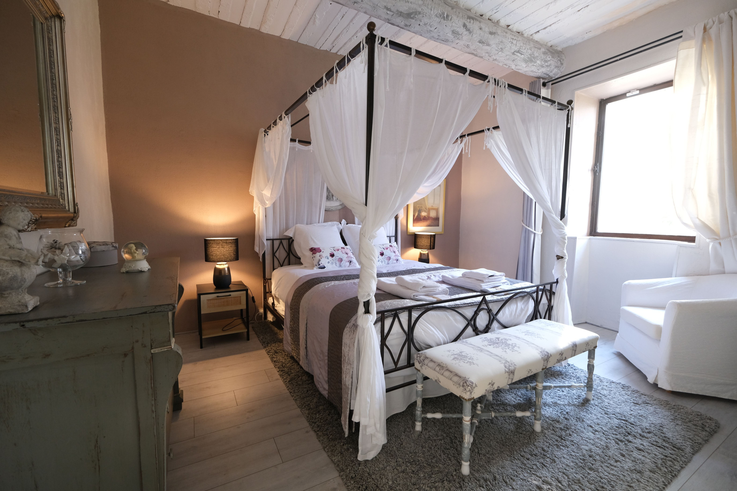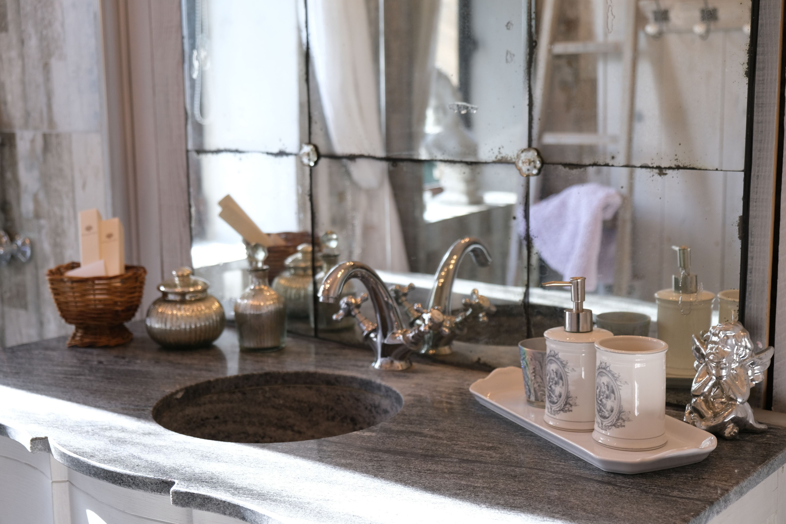 • Une chambre climatisée avec lit double 160, salle d’eau attenante (2 vasques, baignoire, douche et WC), ouvrant sur une jolie véranda face au jardin avec une baignoire pour ce qui aime se détendre en regardant le jardin.