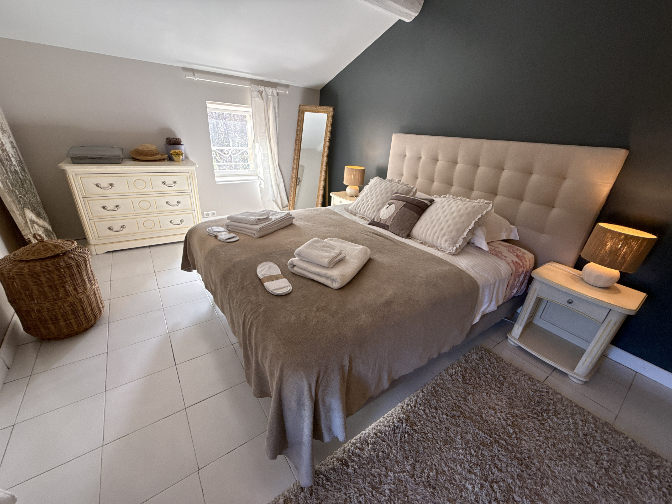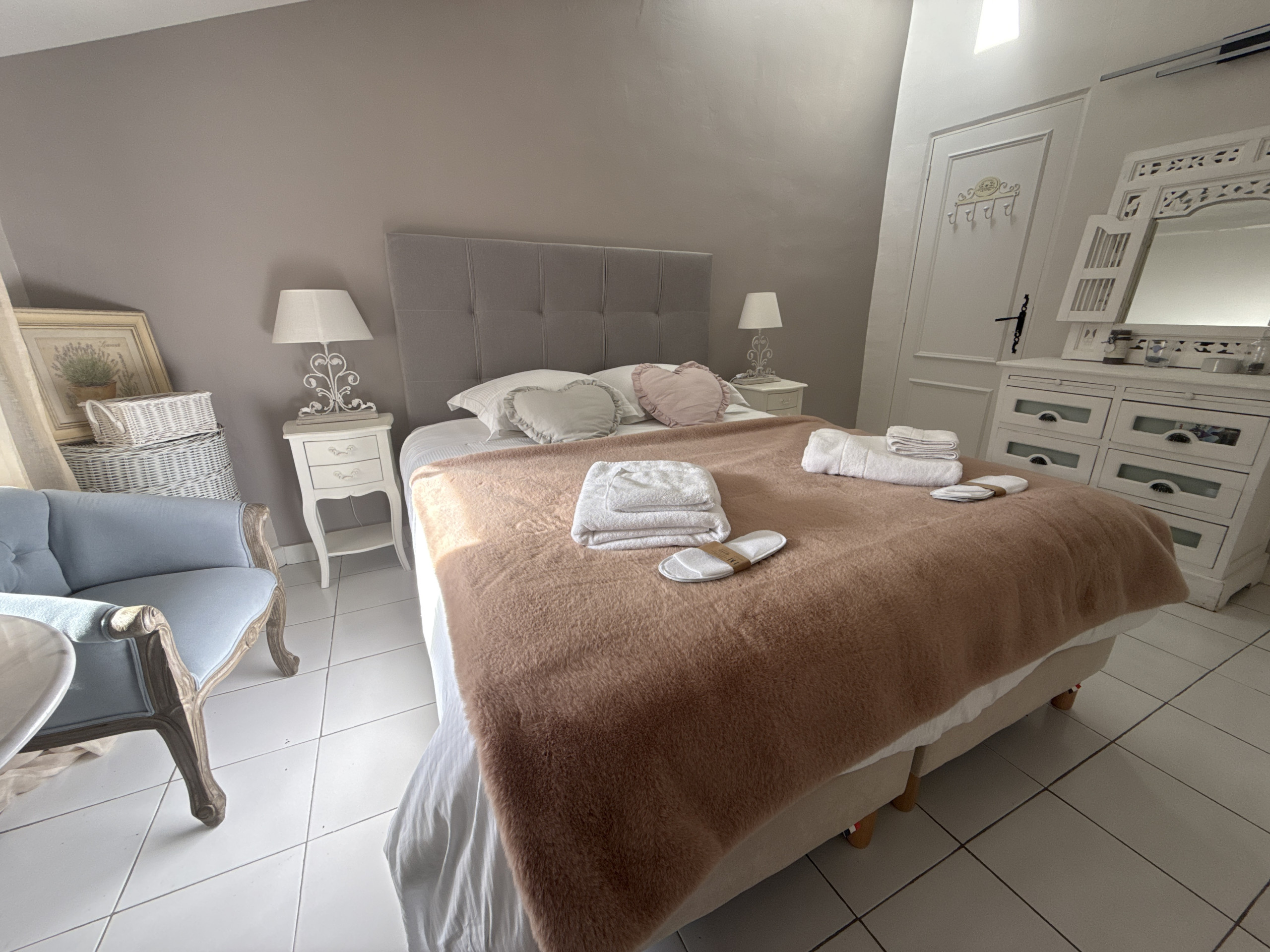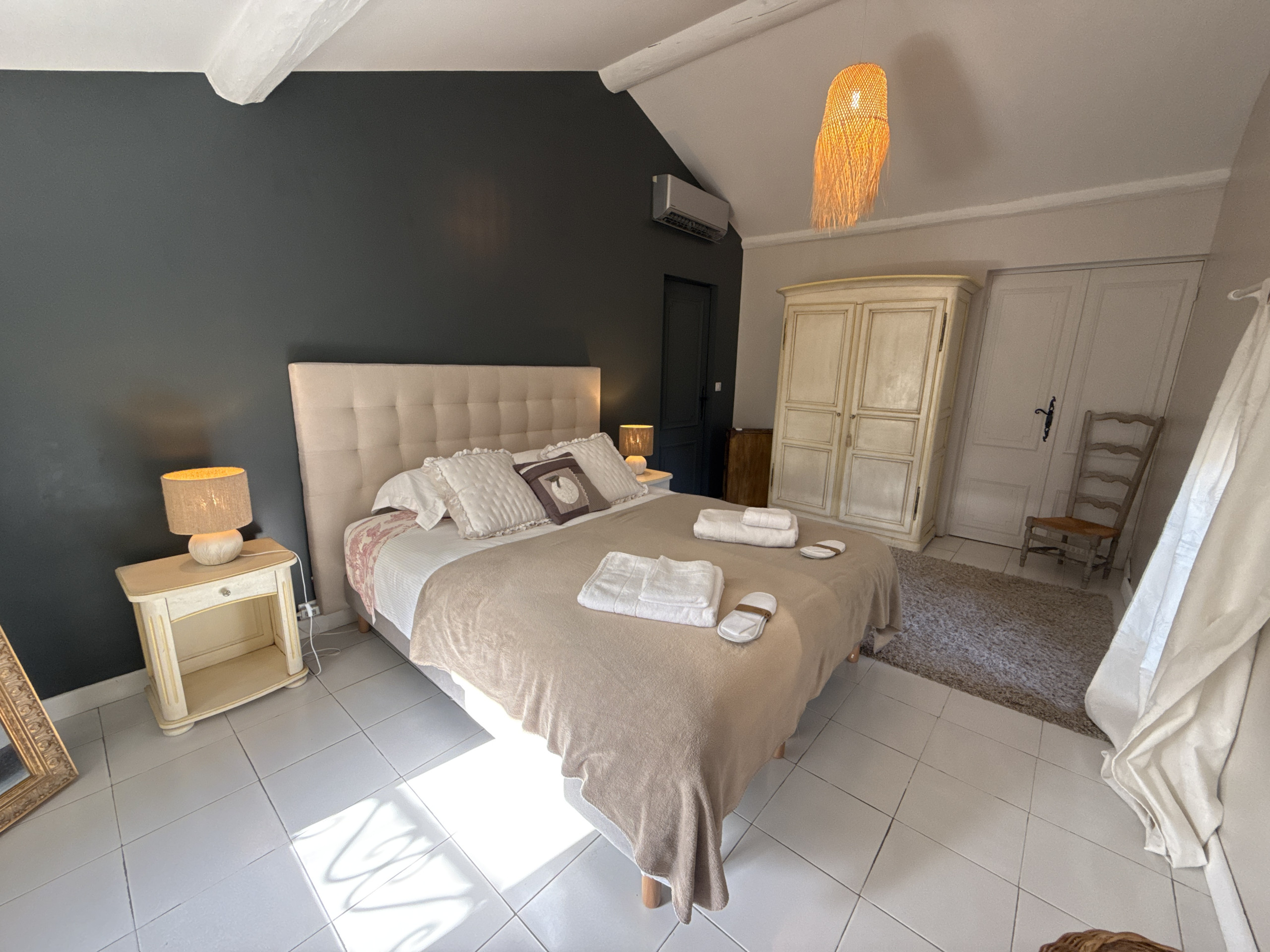 • Une chambre climatisée avec lit double 160 et salle d’eau attenante (1 vasque, 1 douche et 1 WC)