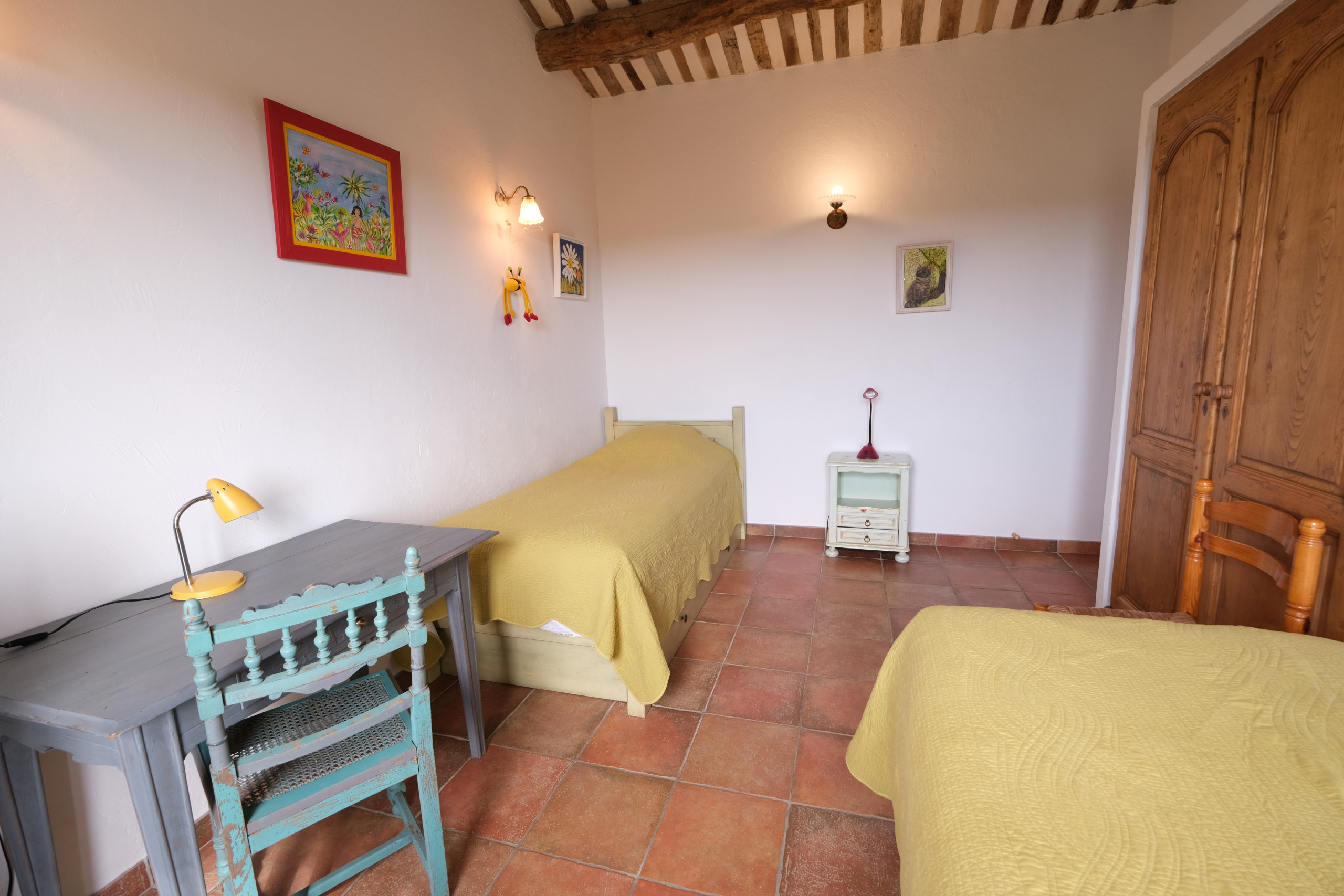 PREMIER ETAGE :Deux chambres :- Chambre (25 m²) ouvrant sur la magnifique vue sur les oliviers et la piscine, avec un lit double 160 avec TV- Chambre (12 m²) avec 2 lits simples 90
