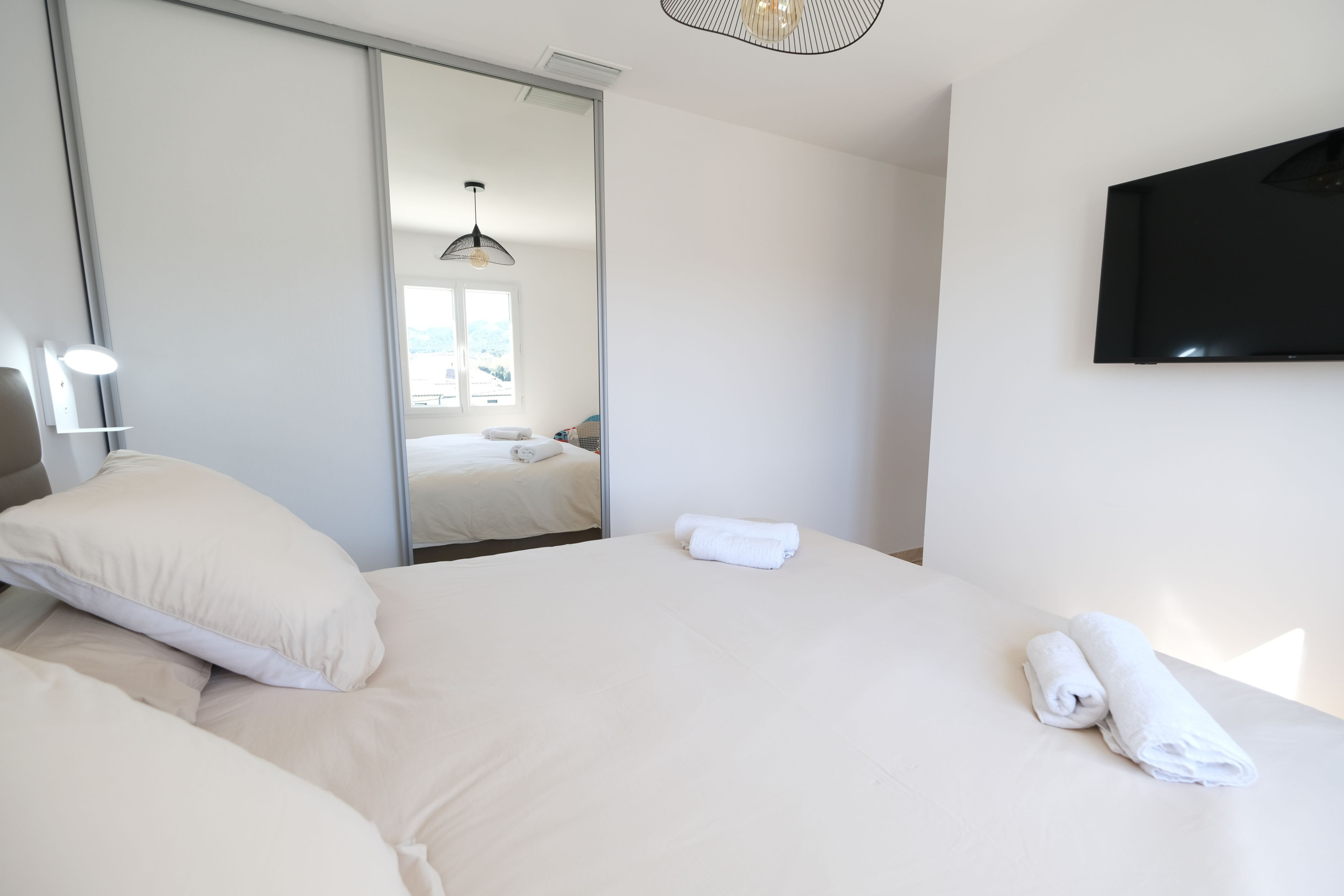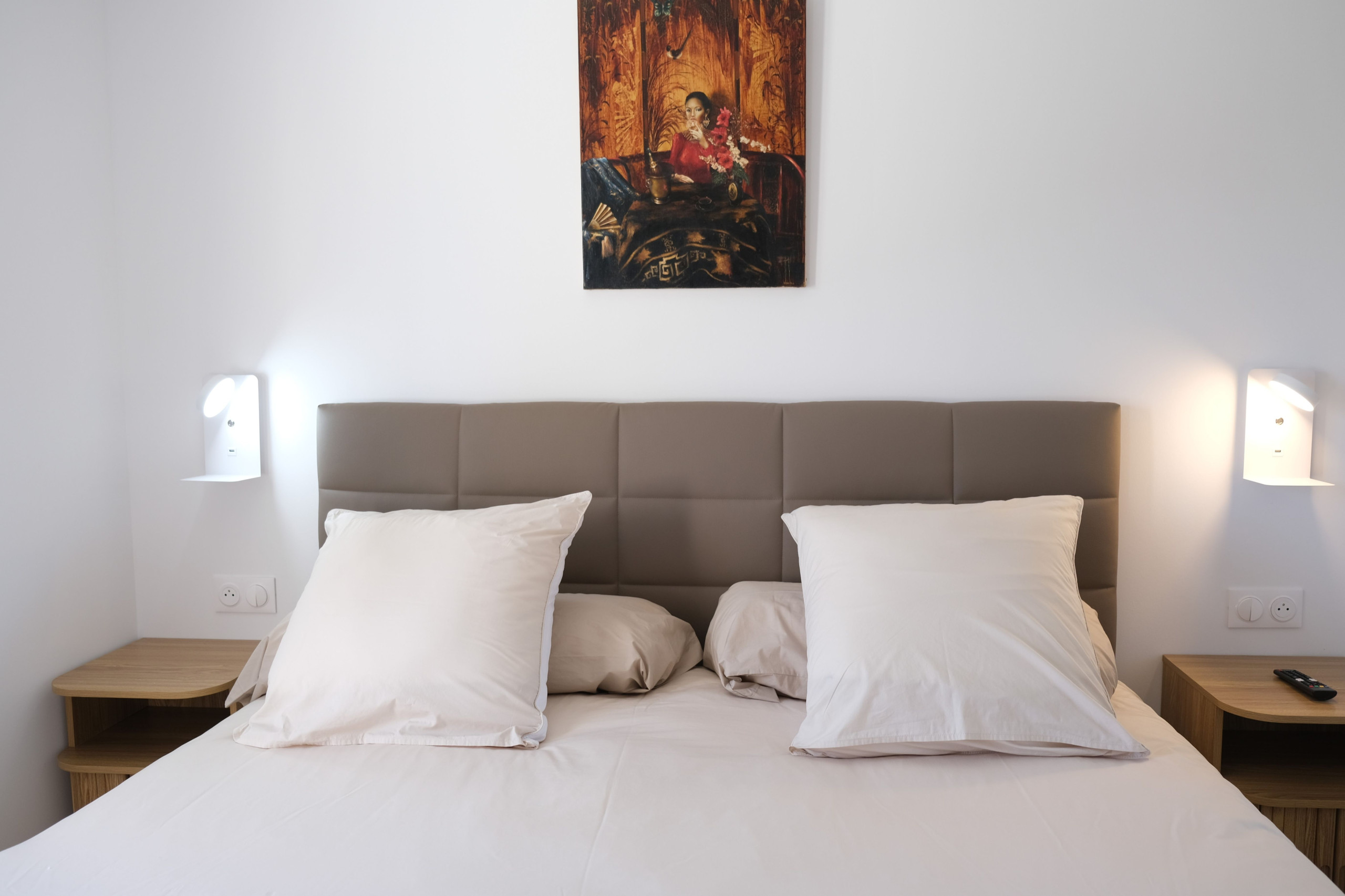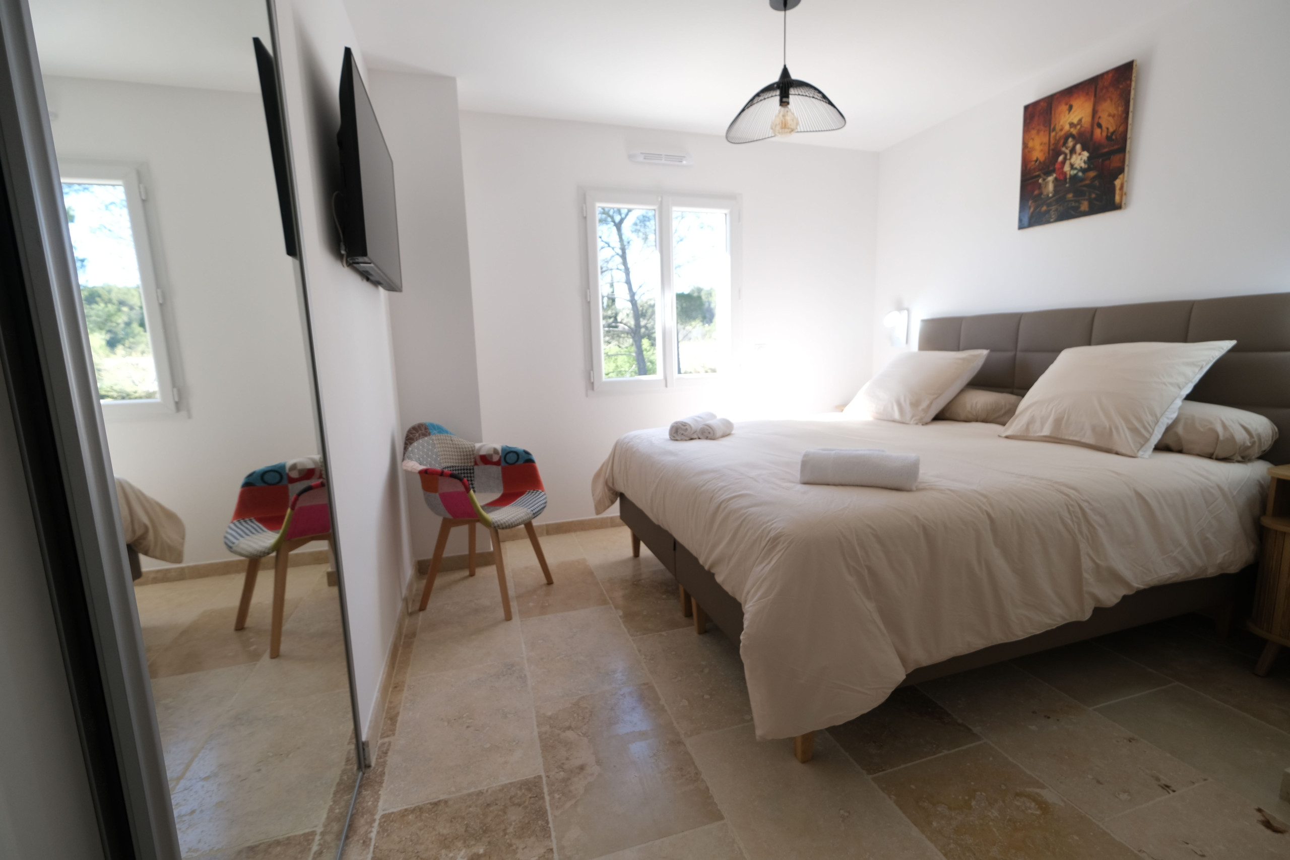 Une chambre climatisée avec lit double 180, salle d’eau attenante (douche, double vasque, sèche-cheveux) et toilette indépendant.