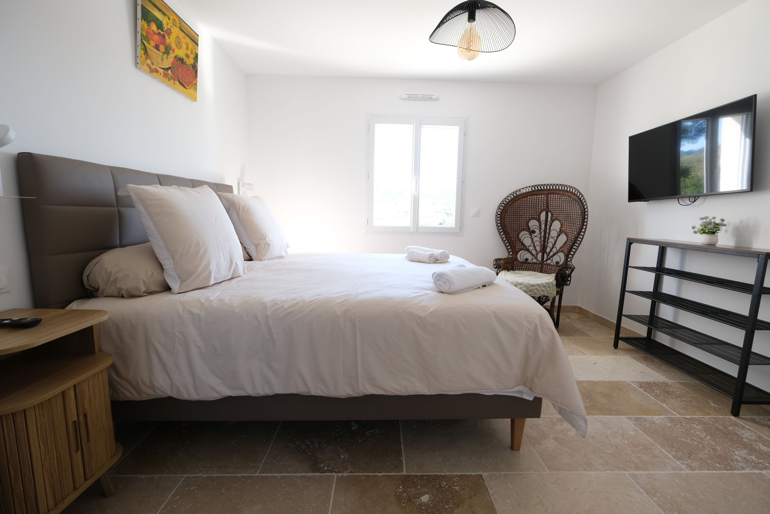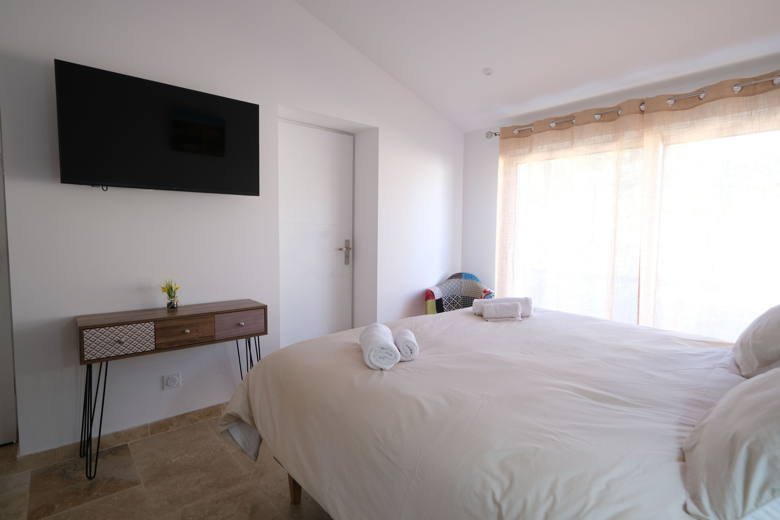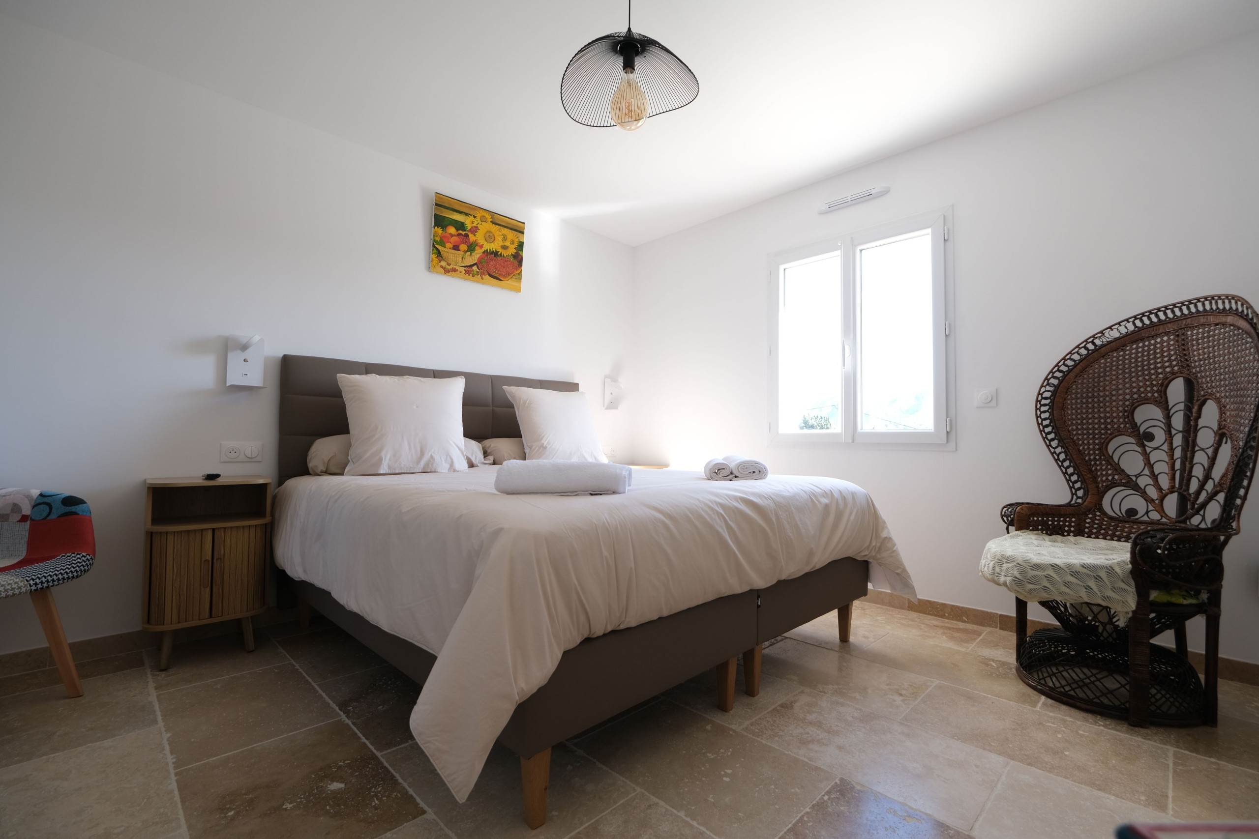 Une chambre climatisée avec lit double 180, salle d’eau attenante (douche, double vasque, sèche-cheveux) et toilette indépendant.