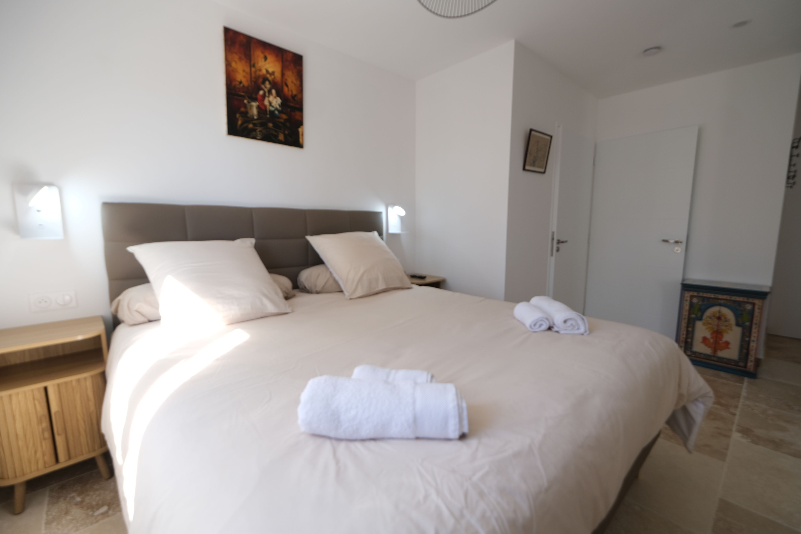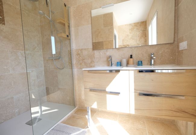 1 chambre (26 m²) avec lit double 180 cm et salle d’eau attenante (douche, WC, 2 vasques)