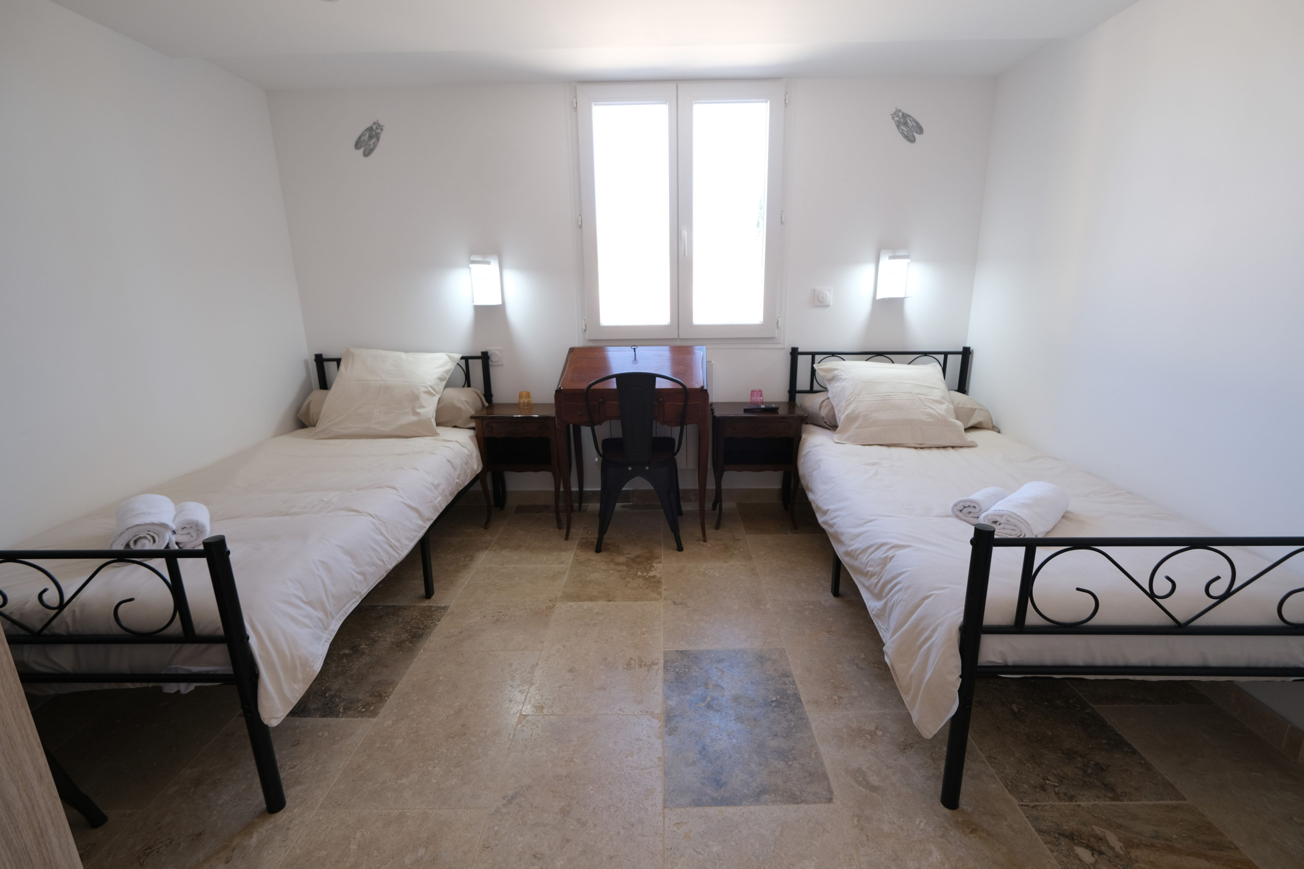 Une chambre avec 2 lits simples 90 et une TV.