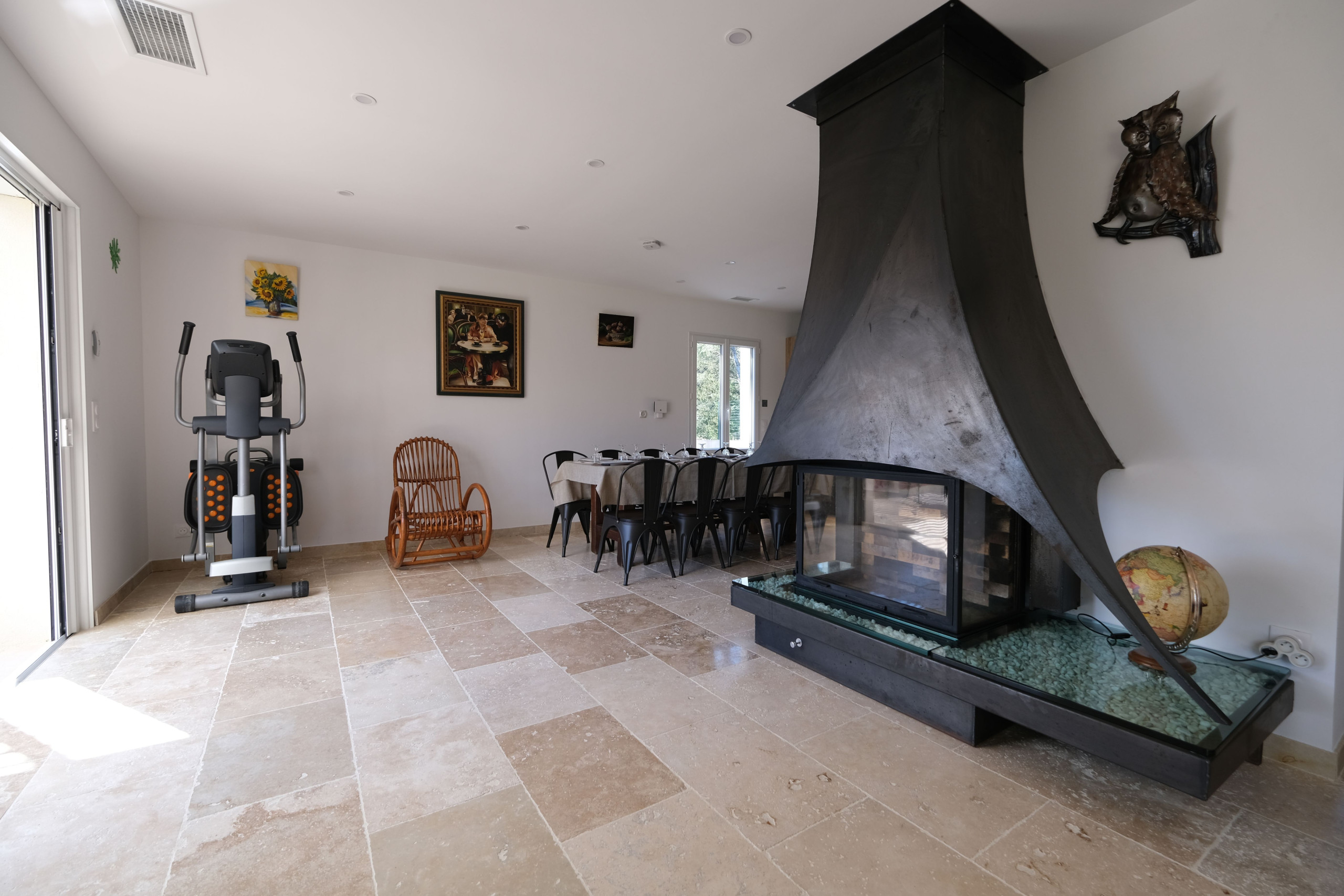Une magnifique pièce de vie climatisée, baignée de lumière grâce à ses larges baies vitrées ouvrant sur le jardin, avec un espace salon et salle à manger, télévision (chaînes locales et satellite), vélo elliptique et canapé confortable.