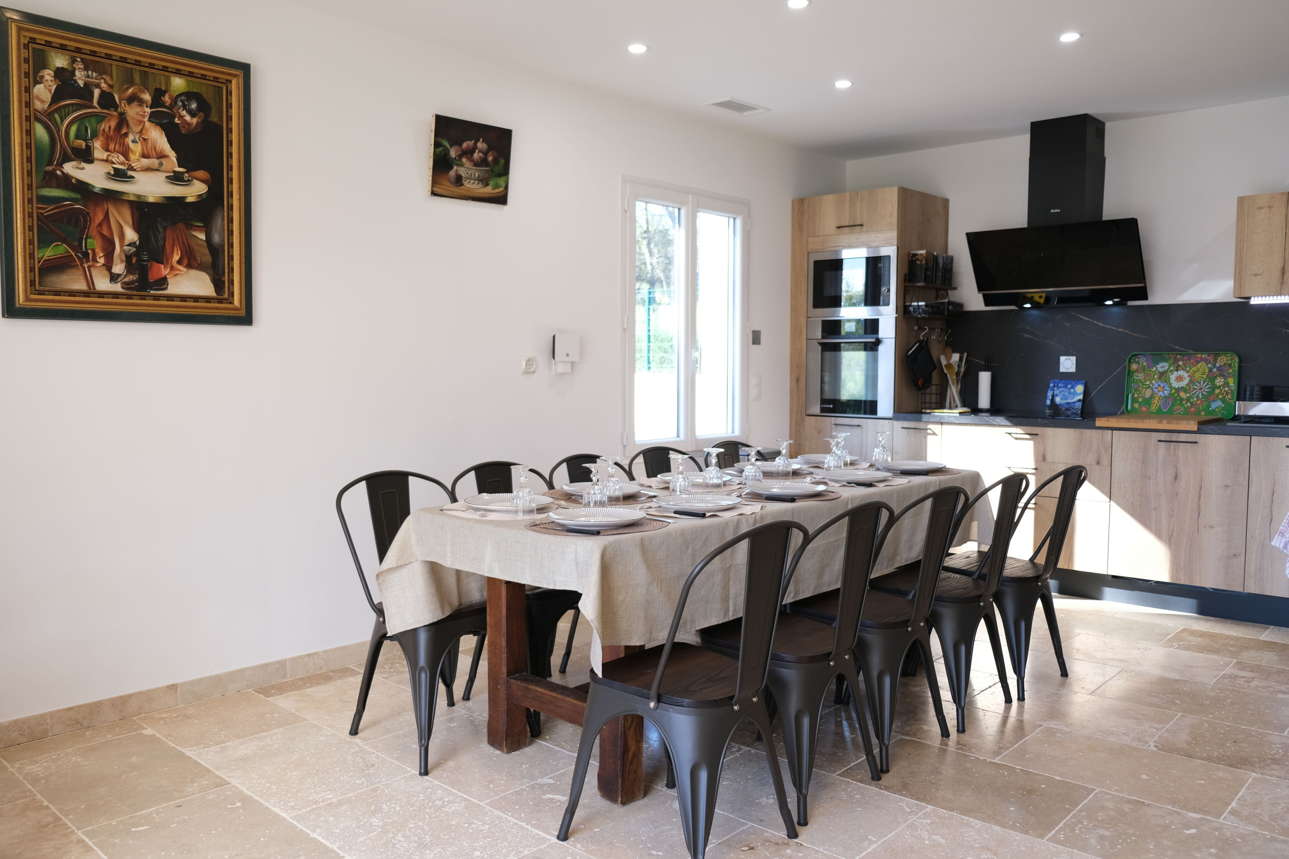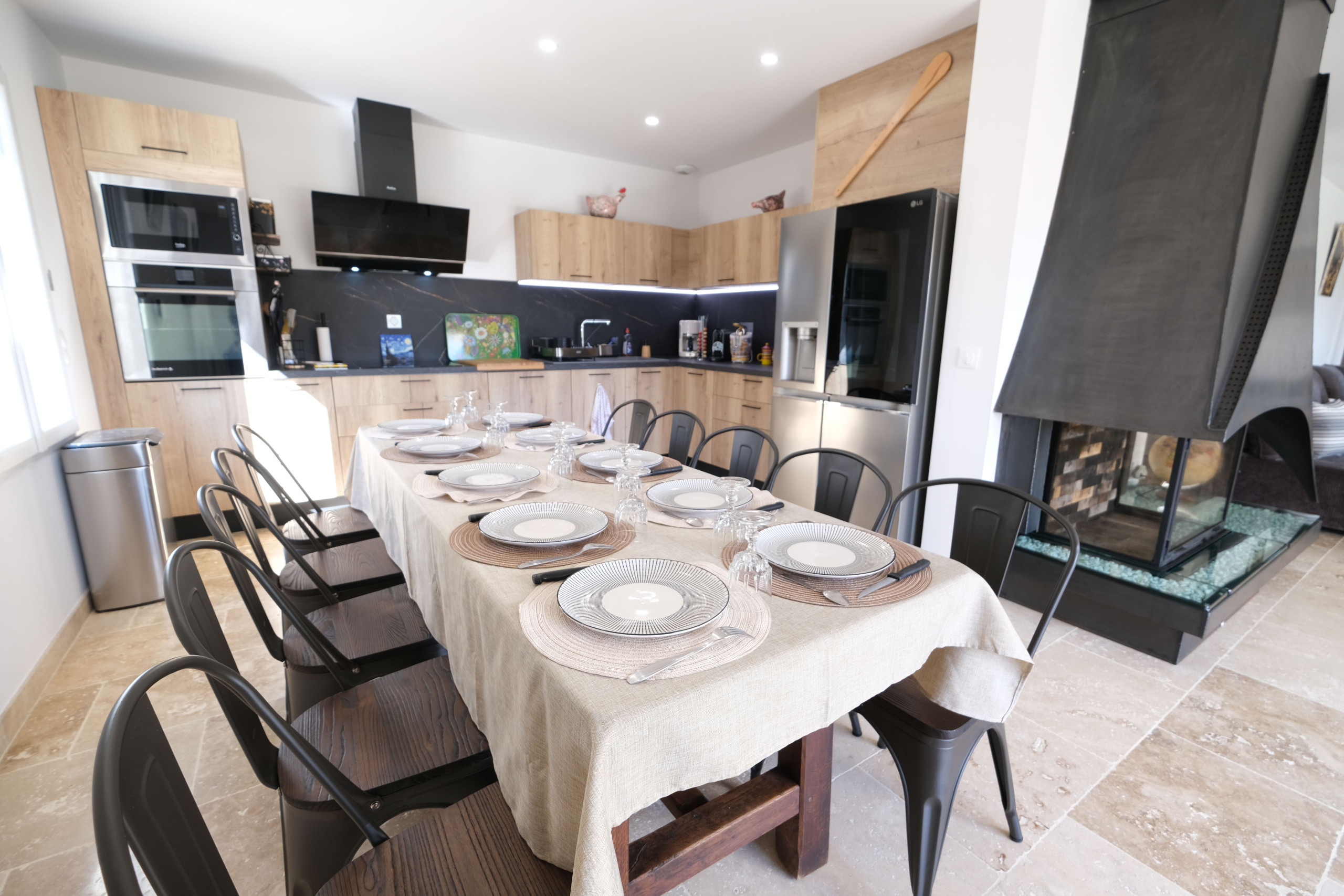 Une cuisine entièrement équipée avec espace repas (table pour 10 personnes), frigo américain, lave-vaisselle, micro-ondes, four, congélateur, bouilloire, toaster, cafetière Nespresso, cafetière à filtre, presse-agrumes, friteuse et plaque de cuisson à induction.