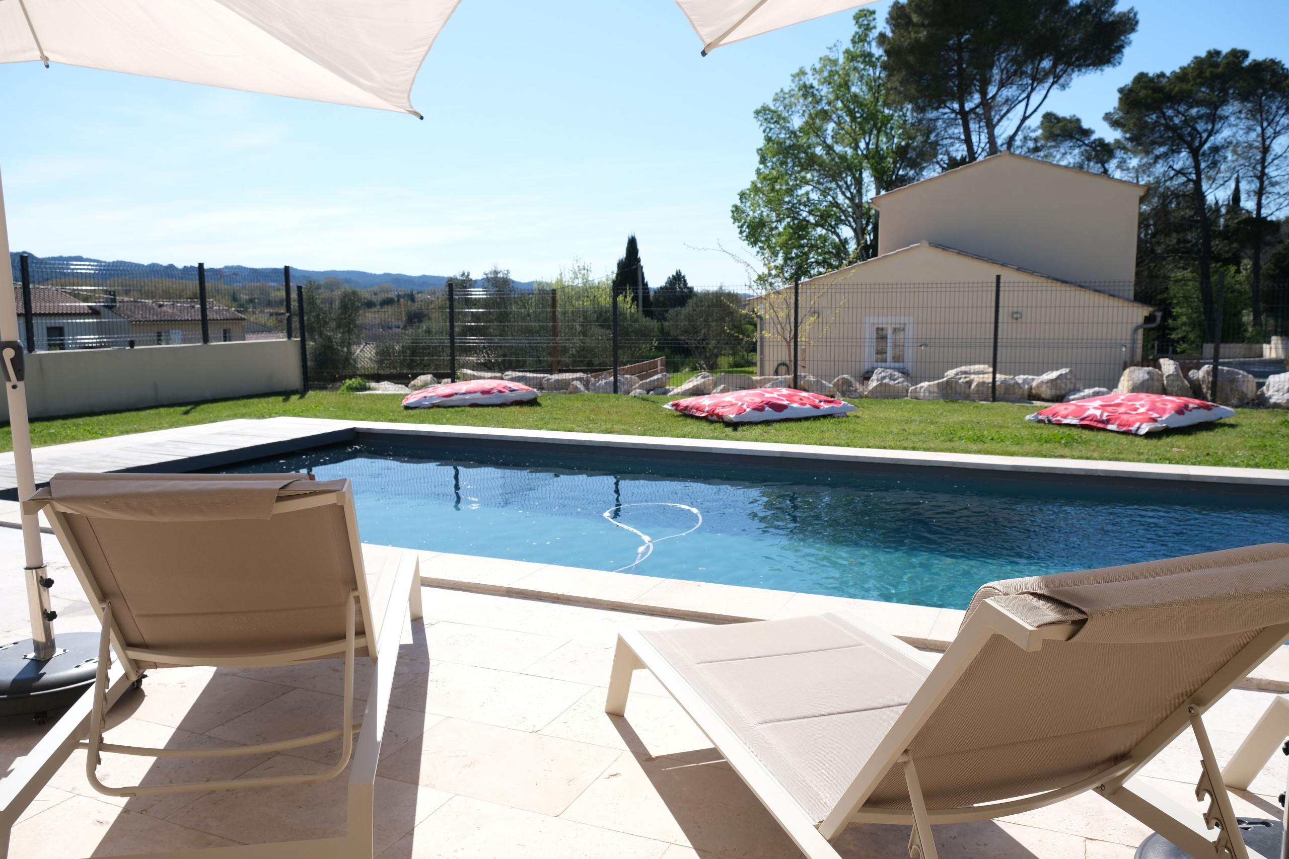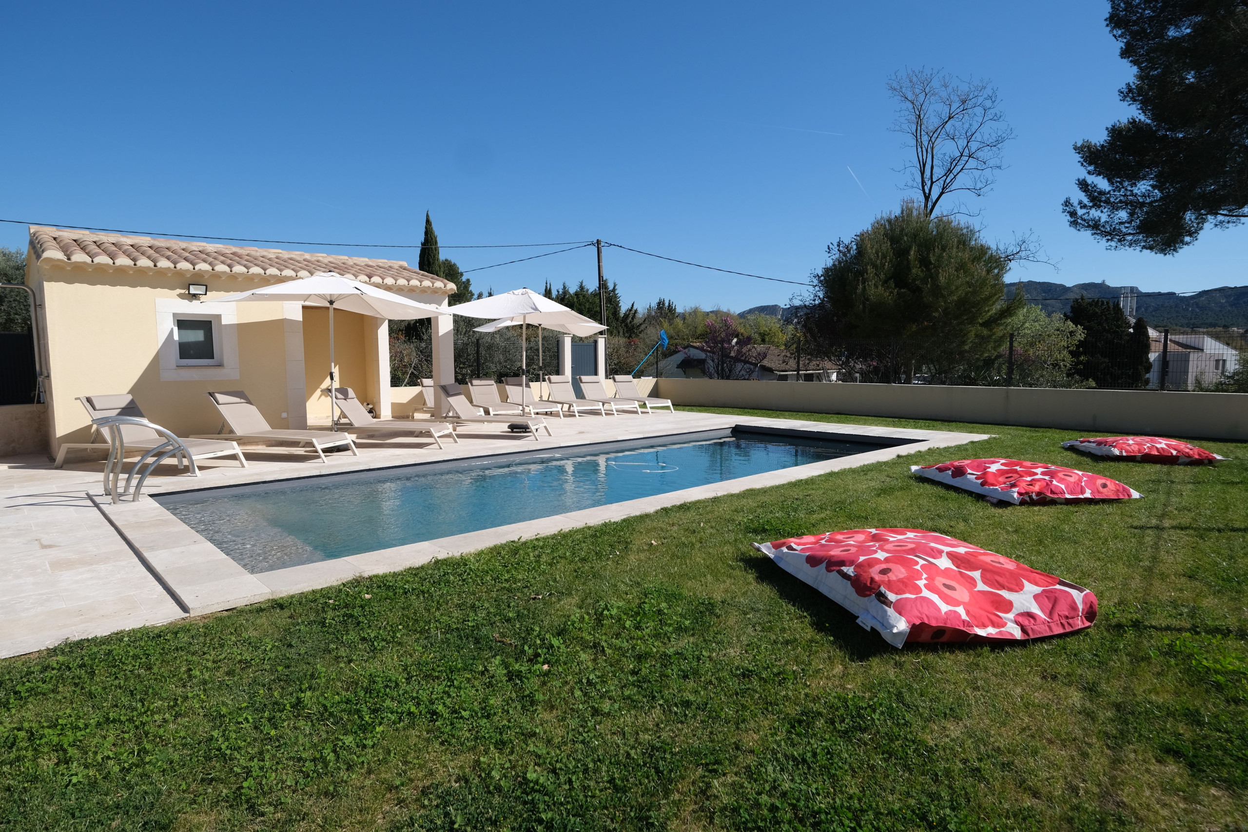 Cette location de vacances à Saint-Rémy-de-Provence propose un superbe espace piscine, véritable lieu de vie, sublimé par la vue exceptionnelle sur les Alpilles.