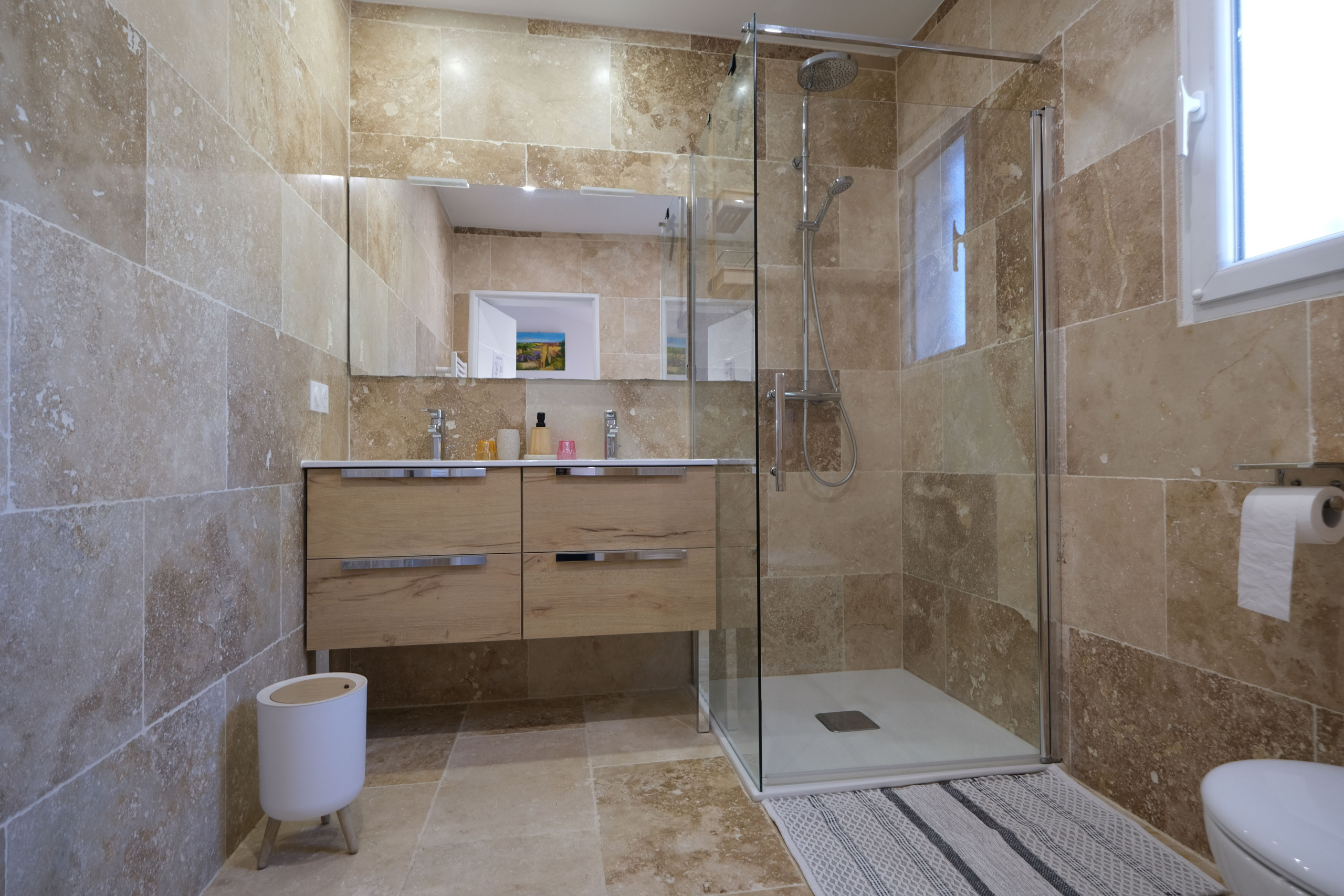 1 chambre (24 m²) avec lit double 180 cm et salle d’eau attenante (douche, 2 vasques)