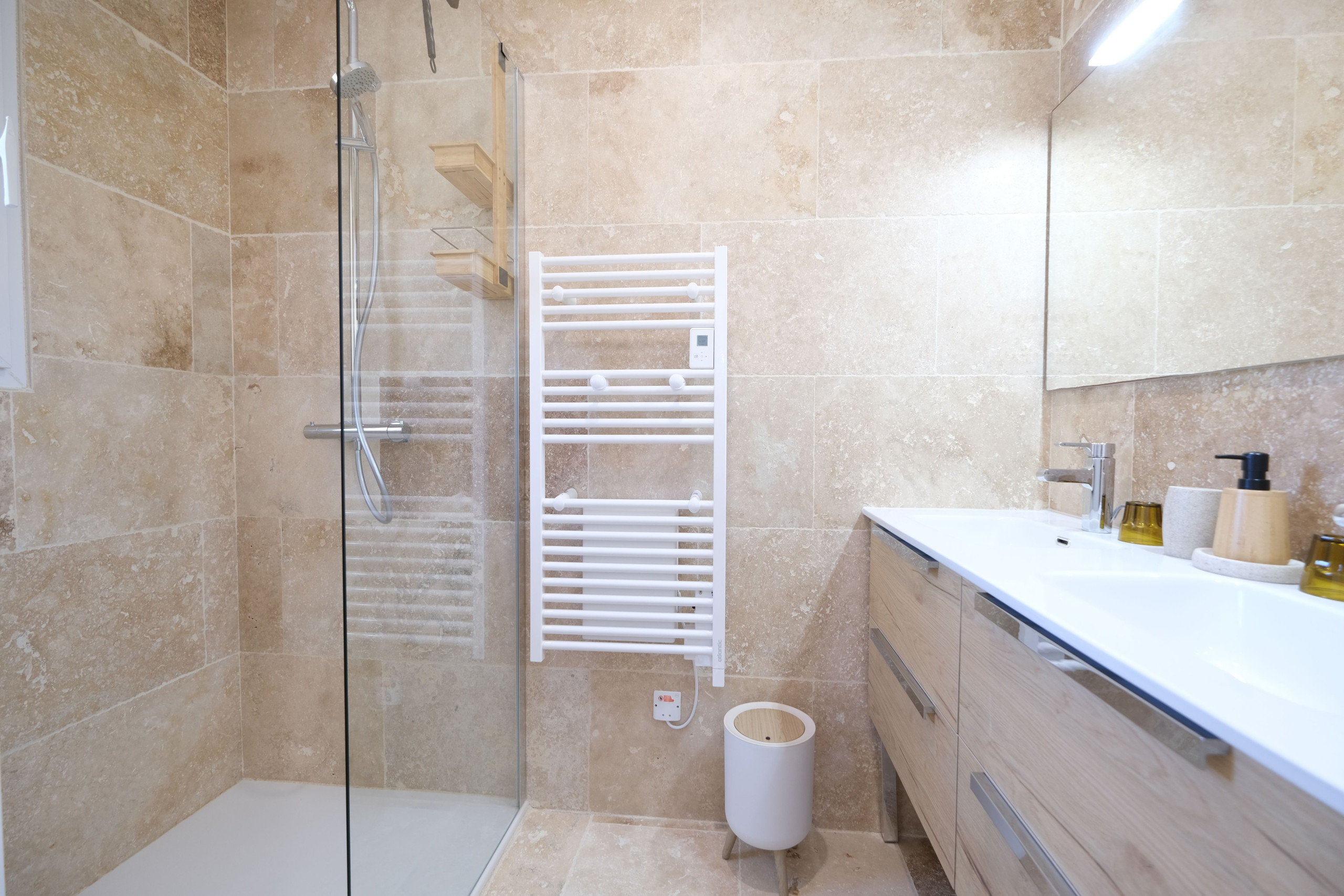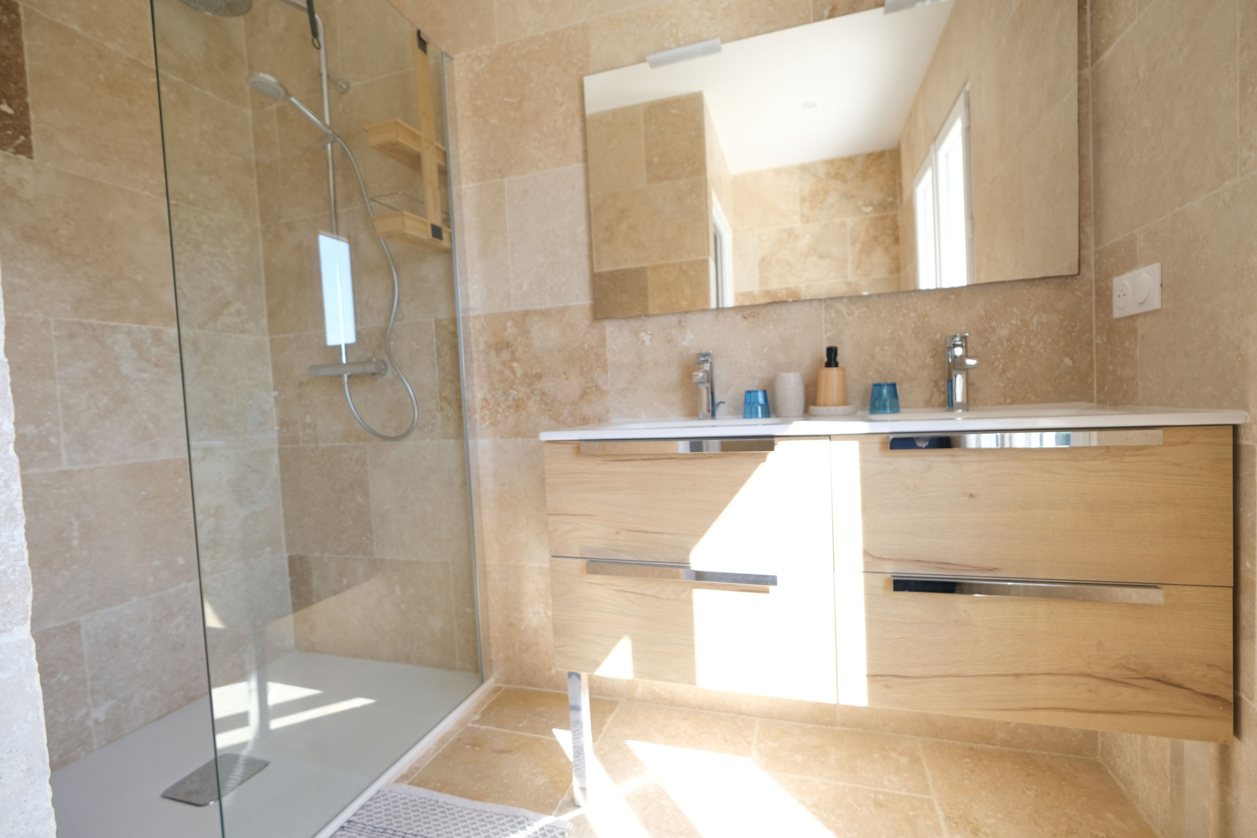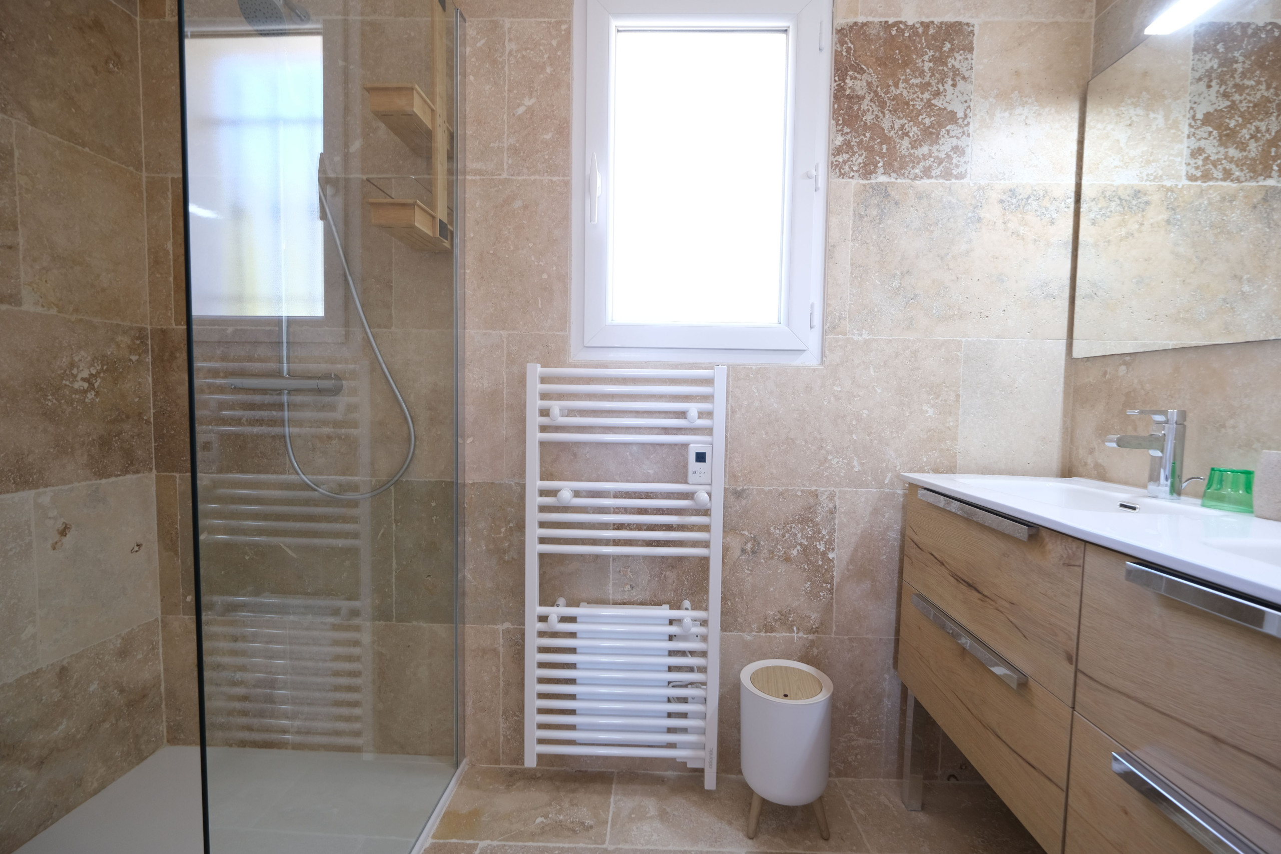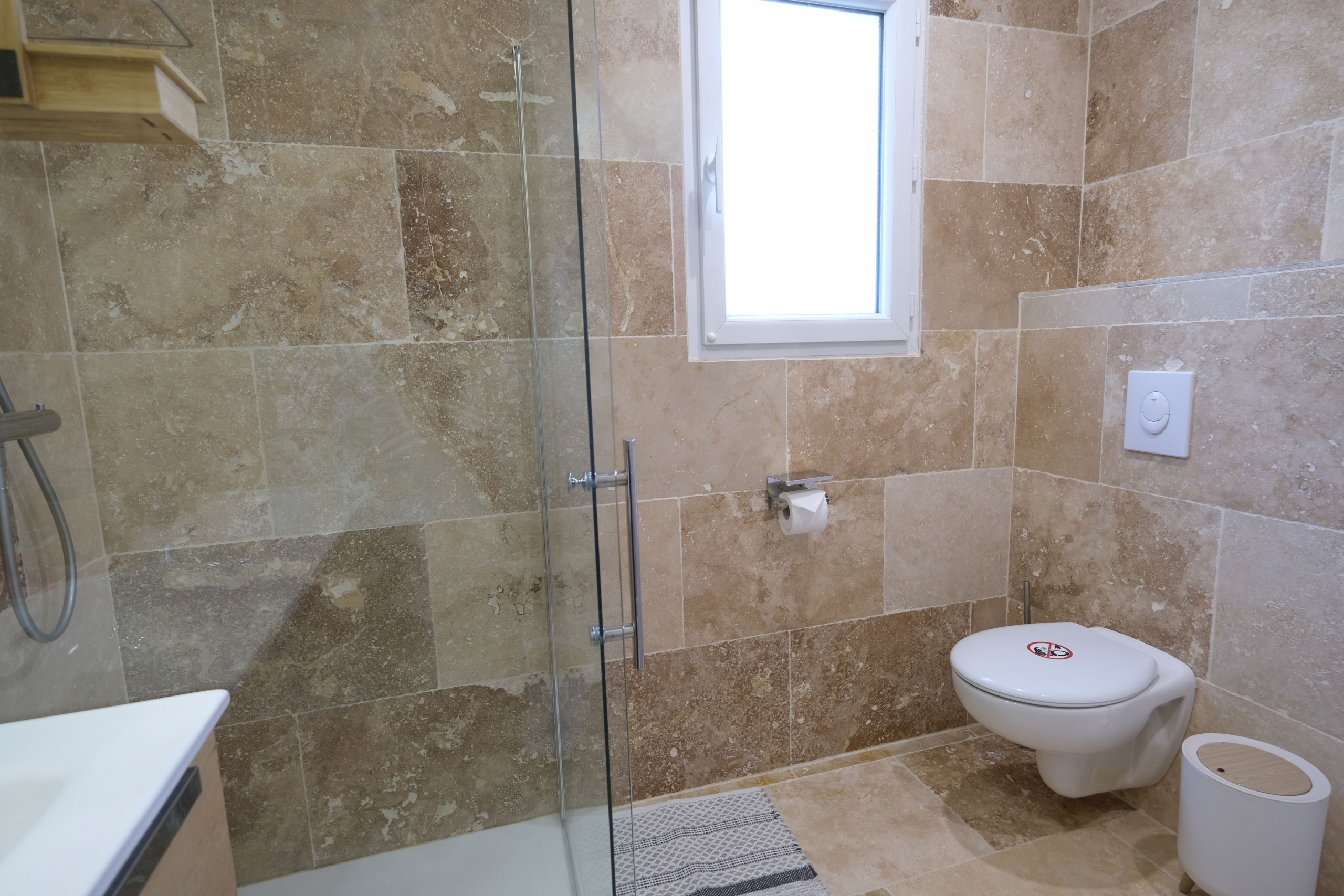 Salle d’eau non aux normes tourisme & handicap (pas de barres, douche non conforme en largeur mais accessible avec aide)