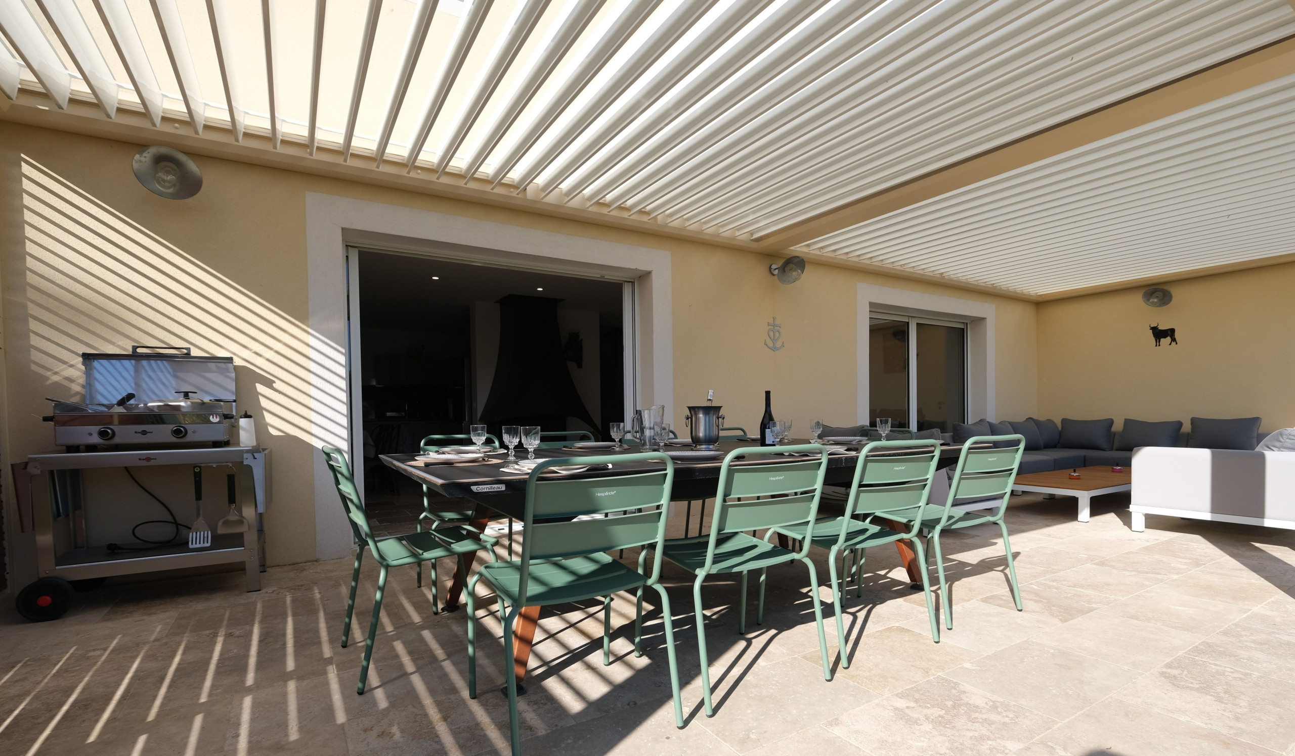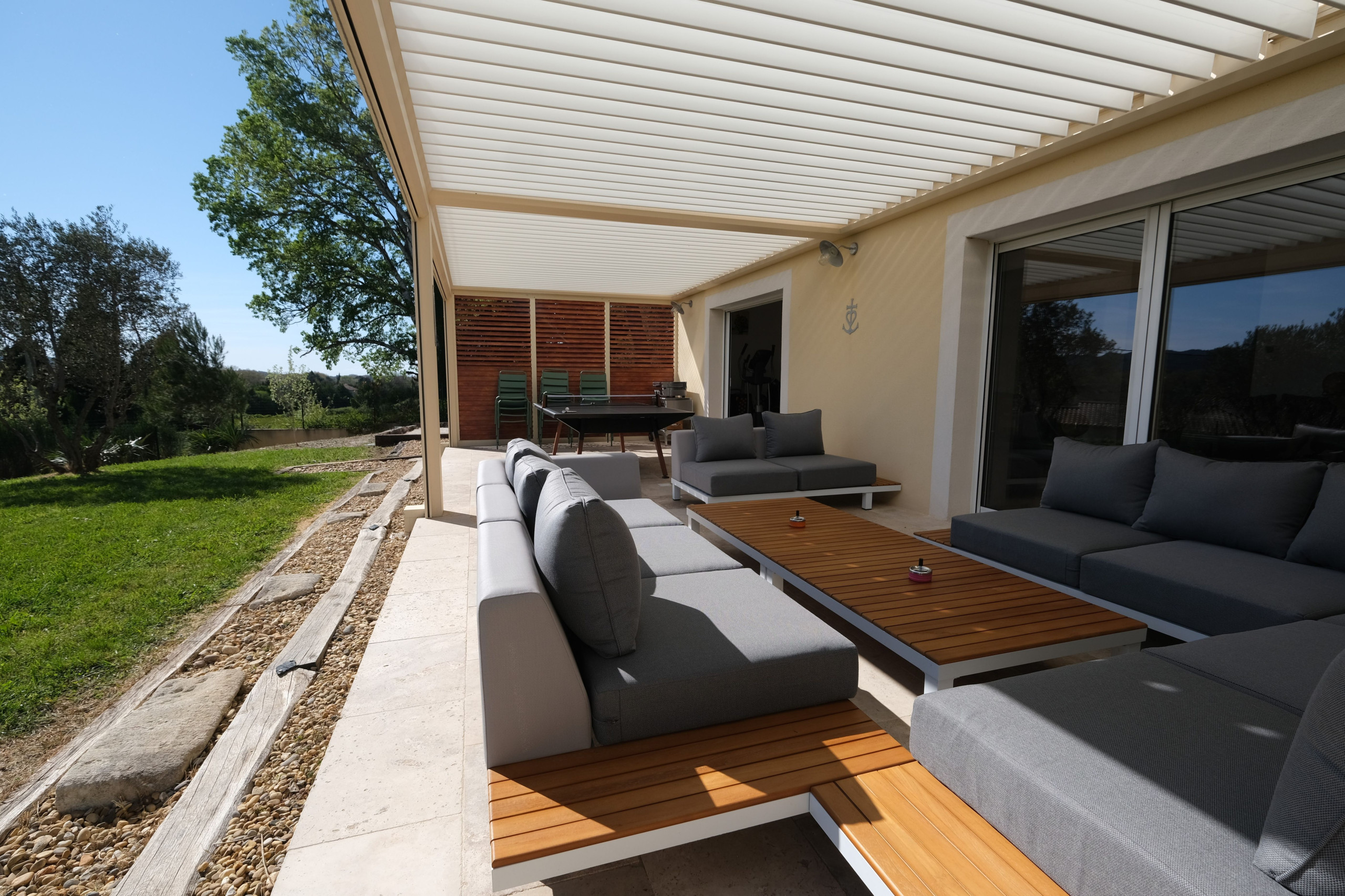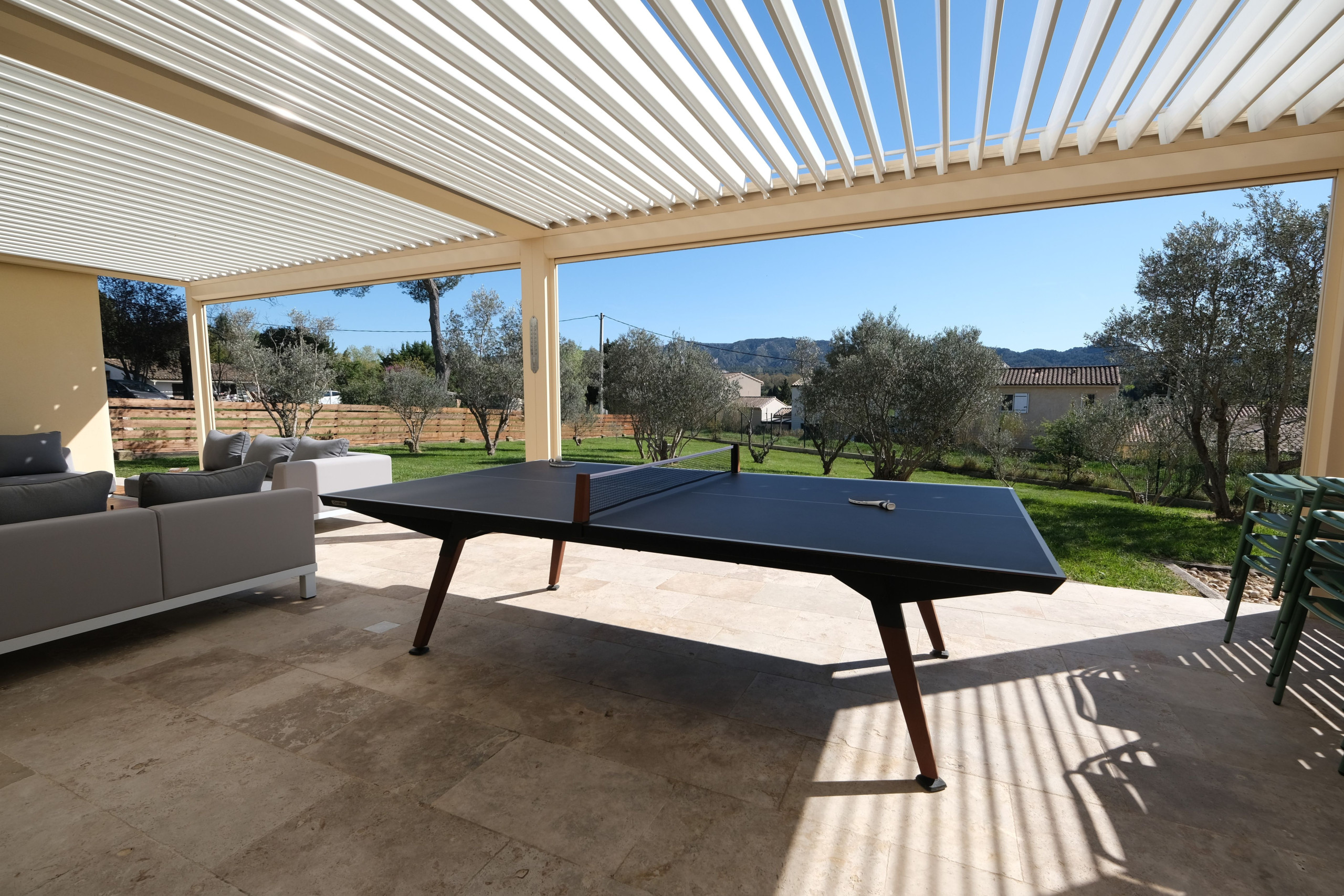 La maison dispose également d’une seconde terrasse ombragée par une élégante pergola bioclimatique exposée plein sud, avec plancha électrique, table modulable en ping-pong, 10 chaises et un vaste salon de jardin — idéal pour des moments conviviaux en extérieur.