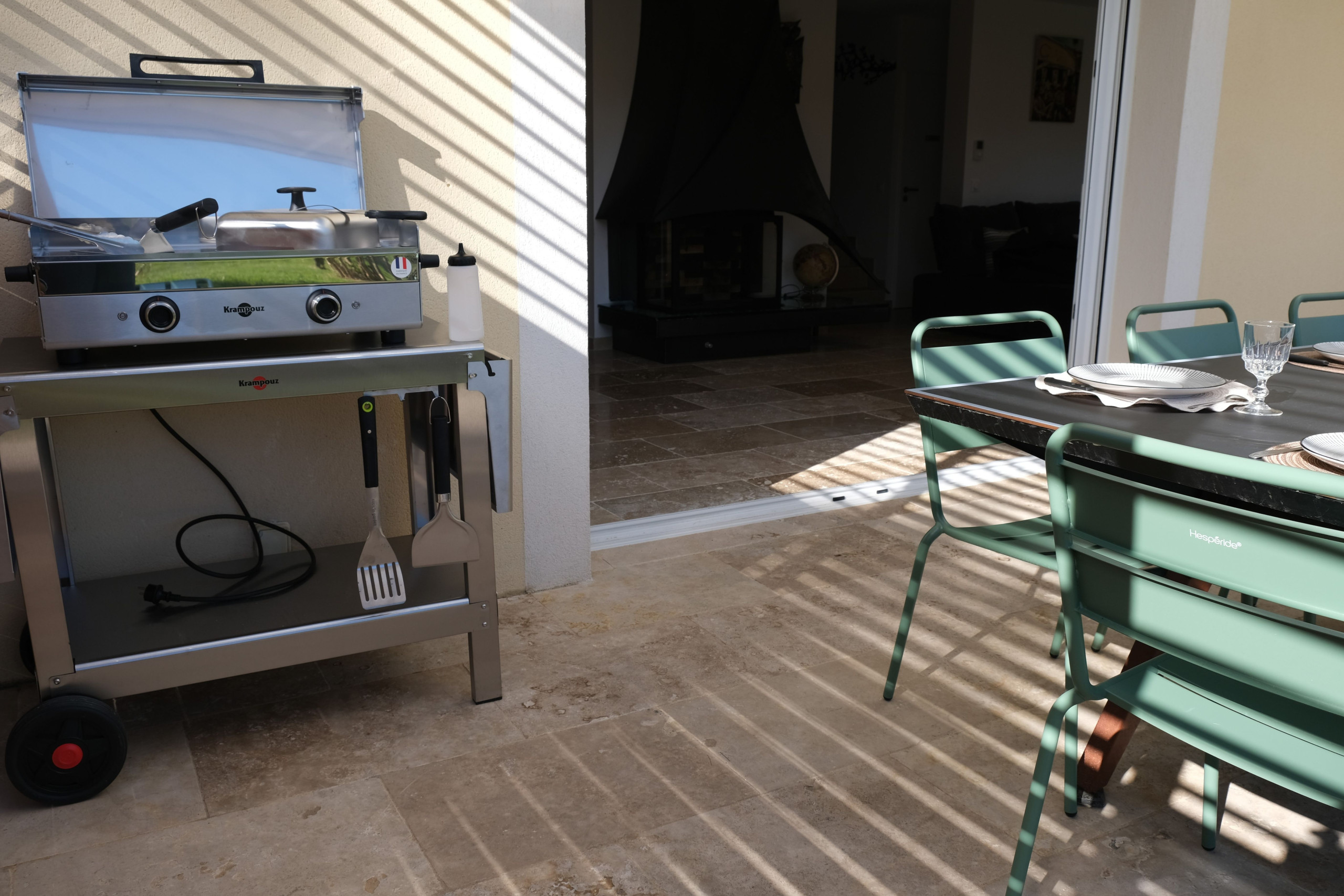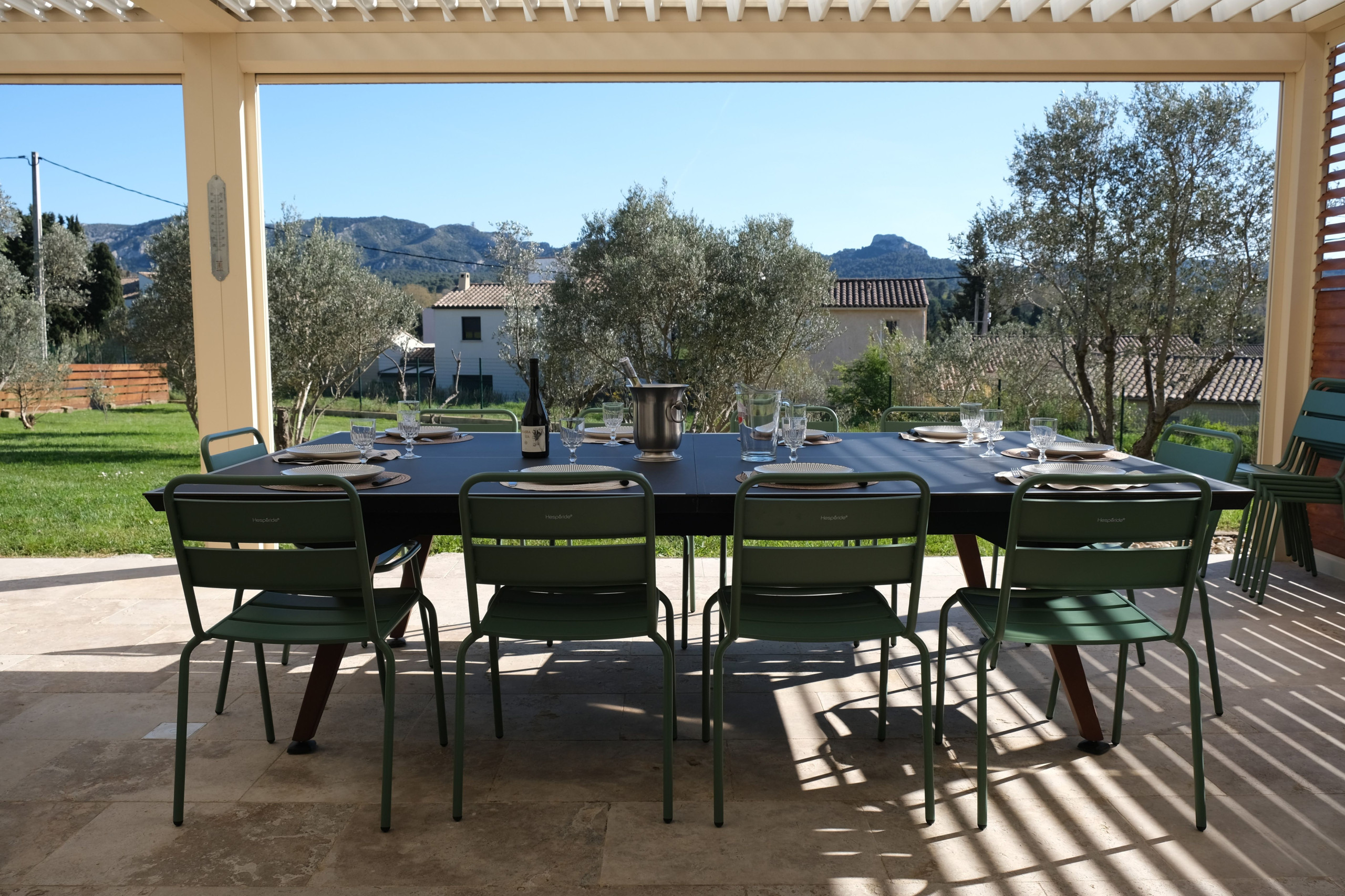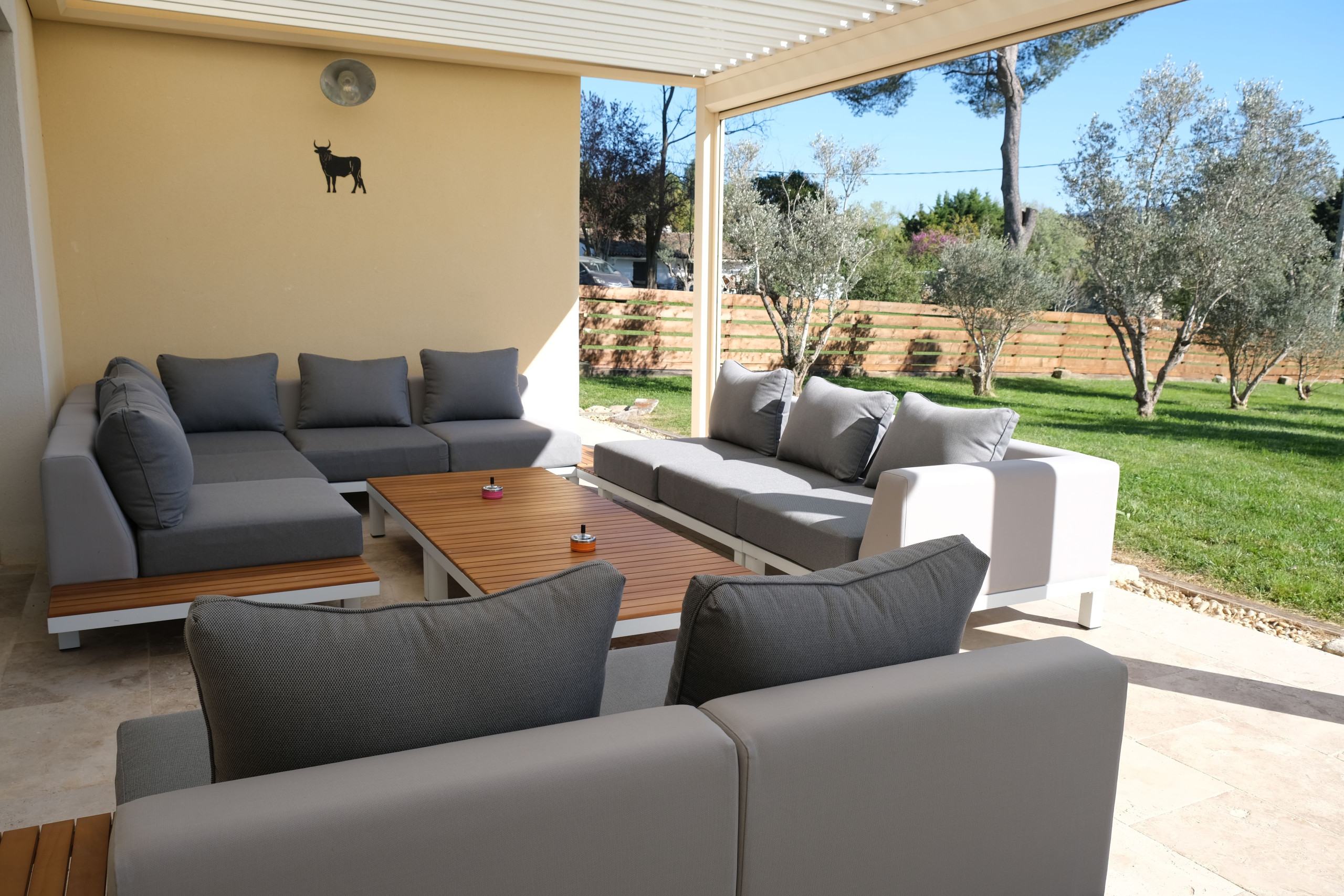 La maison dispose également d’une seconde terrasse ombragée par une élégante pergola bioclimatique exposée plein sud, avec plancha électrique, table modulable en ping-pong, 10 chaises et un vaste salon de jardin — idéal pour des moments conviviaux en extérieur.
