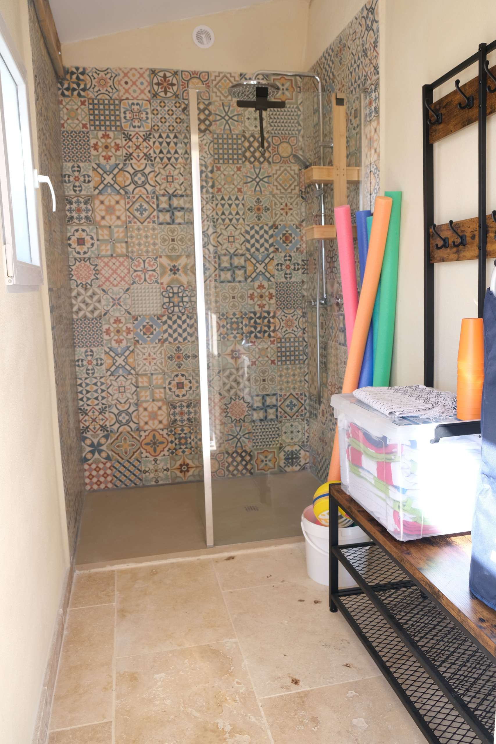 1 terrasse ombragée avec un espace dédié comprenant une douche et des jeux de piscine.
